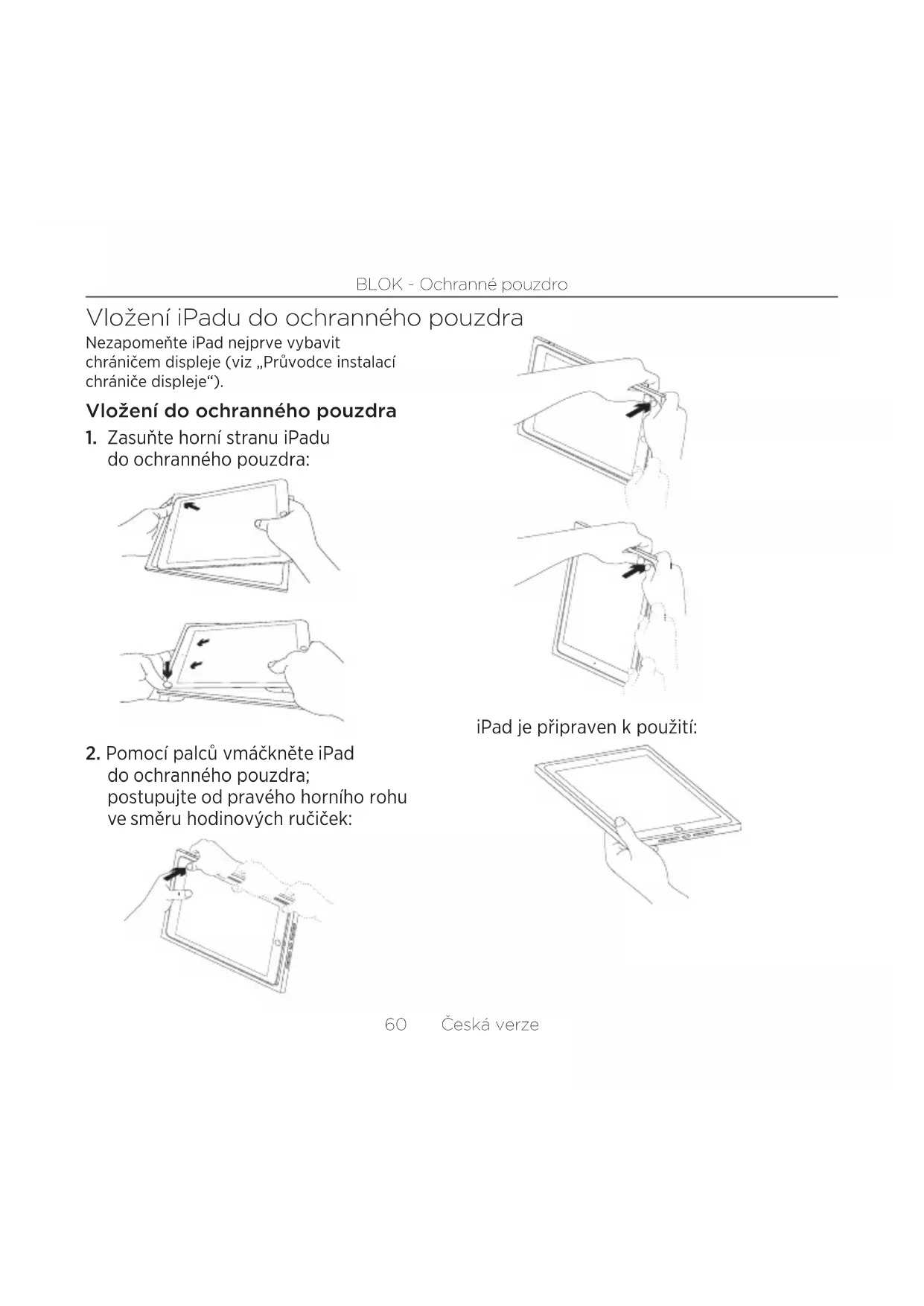 do ochranného pouzdra; postupujte od pravého horního rohu ve směru hodinových ručiček: iPad je připraven k použití:Česká verze 61 BLOK - Ochranné pouzdro Vyjmutí iPadu z ochranného pouzdra