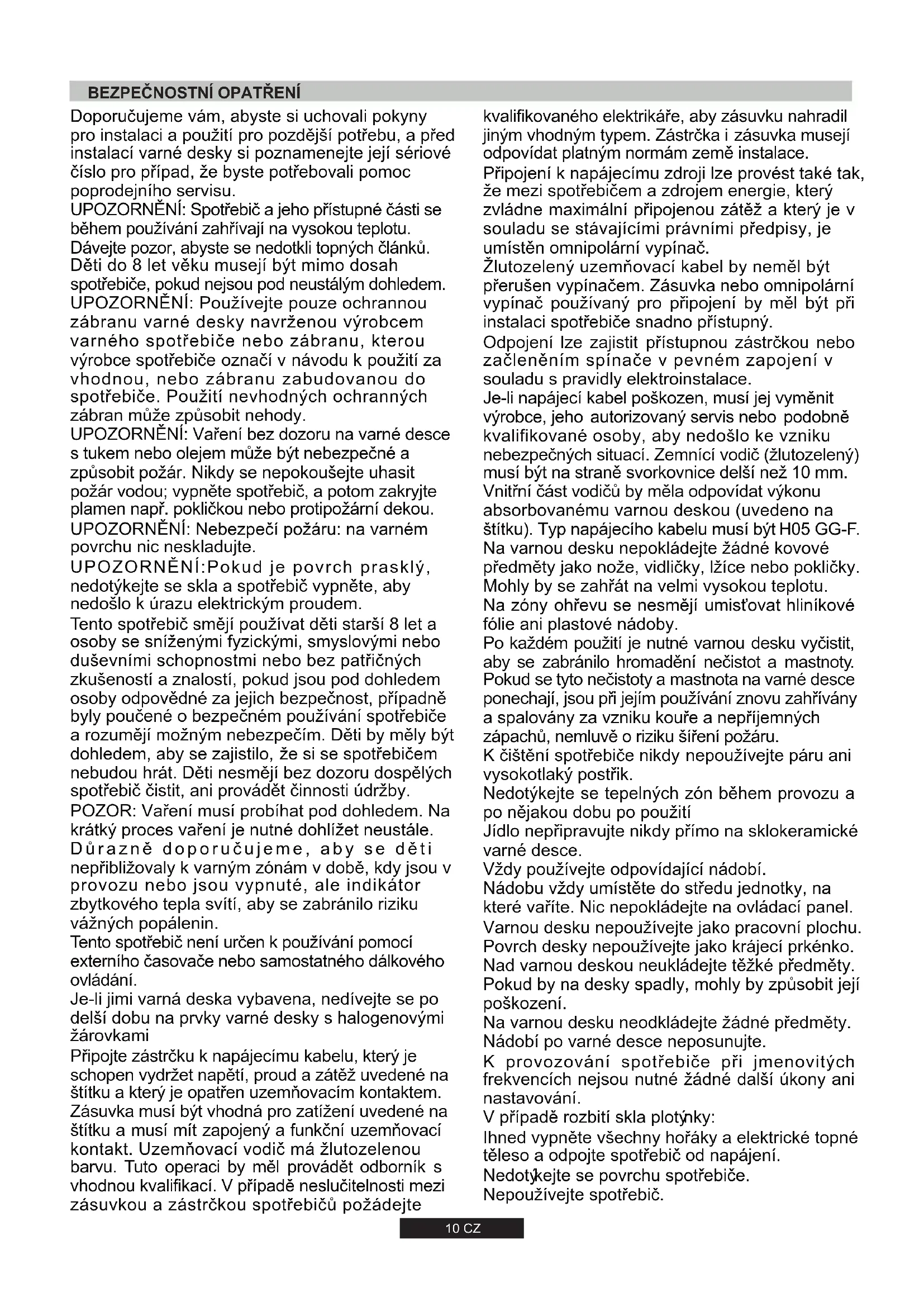 En utilisant le symbol sur ce produit, nous déclarons sur notre propre responsabilité que ce produit est conforme à toutes les normes Européennes relatives à la sécurité, la santé et à l’environnement. L'appareil est conforme à la Directive européenne 2009/142/CE (GAD) et à partir du 21/04/2018, à la Réglementation sur les appareils à gaz 2016/426 (GAR).10 CZ UPOZORNĚNÍ: Používejte pouze ochrannou zábranu varné desky navrženou výrobcem varného spotřebiče nebo zábranu, kterou výrobce spotřebiče označí v návodu k použití za vhodnou, nebo zábranu zabudovanou do spotřebiče. Použití nevhodných ochranných zábran může způsobit nehody. UPOZORNĚNÍ: Spotřebič a jeho přístupné části se během používání zahřívají na vysokou teplotu. Dávejte pozor, abyste se nedotkli topných článků. Děti do 8 let věku musejí být mimo dosah spotřebiče, pokud nejsou pod neustálým dohledem. UPOZORNĚNÍ: Nebezpečí požáru: na varném povrchu nic neskladujte. UPOZORNĚNÍ:Pokud je povrch prasklý, nedotýkejte se skla a spotřebič vypněte, aby nedošlo k úrazu elektrickým proudem. POZOR: Vaření musí probíhat pod dohledem. Na krátký proces vaření je nutné dohlížet neustále. Důrazně doporučujeme, aby se děti nepřibližovaly k varným zónám v době, kdy jsou v provozu nebo jsou vypnuté, ale indikátor zbytkového tepla svítí, aby se zabránilo riziku vážných popálenin. Je-li jimi varná deska vybavena, nedívejte se po delší dobu na prvky varné desky s halogenovými žárovkami Doporučujeme vám, abyste si uchovali pokyny pro instalaci a použití pro pozdější potřebu, a před instalací varné desky si poznamenejte její sériové číslo pro případ, že byste potřebovali pomoc poprodejního servisu. UPOZORNĚNÍ: Vaření bez dozoru na varné desce s tukem nebo olejem může být nebezpečné a způsobit požár. Nikdy se nepokoušejte uhasit požár vodou; vypněte spotřebič, a potom zakryjte plamen např. pokličkou nebo protipožární dekou. Tento spotřebič smějí používat děti starší 8 let a osoby se sníženými fyzickými, smyslovými nebo duševními schopnostmi nebo bez patřičných zkušeností a znalostí, pokud jsou pod dohledem osoby odpovědné za jejich bezpečnost, případně byly poučené o bezpečném používání spotřebiče a rozumějí možným nebezpečím. Děti by měly být dohledem, aby se zajistilo, že si se spotřebičem nebudou hrát. Děti nesmějí bez dozoru dospělých spotřebič čistit, ani provádět činnosti údržby. Připojte zástrčku k napájecímu kabelu, který je schopen vydržet napětí, proud a zátěž uvedené na štítku a který je opatřen uzemňovacím kontaktem. Zásuvka musí být vhodná pro zatížení uvedené na štítku a musí mít zapojený a funkční uzemňovací kontakt. Uzemňovací vodič má žlutozelenou barvu. Tuto operaci by měl provádět odborník s vhodnou kvalifikací. V případě neslučitelnosti mezi zásuvkou a zástrčkou spotřebičů požádejte Tento spotřebič není určen k používání pomocí externího časovače nebo samostatného dálkového ovládání.