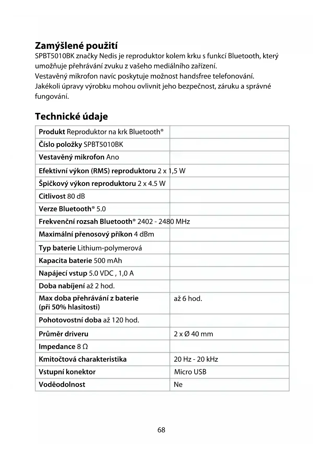 Najděte návod k zařízení zdarma SPBT5010BK NEDIS ve formátu PDF.