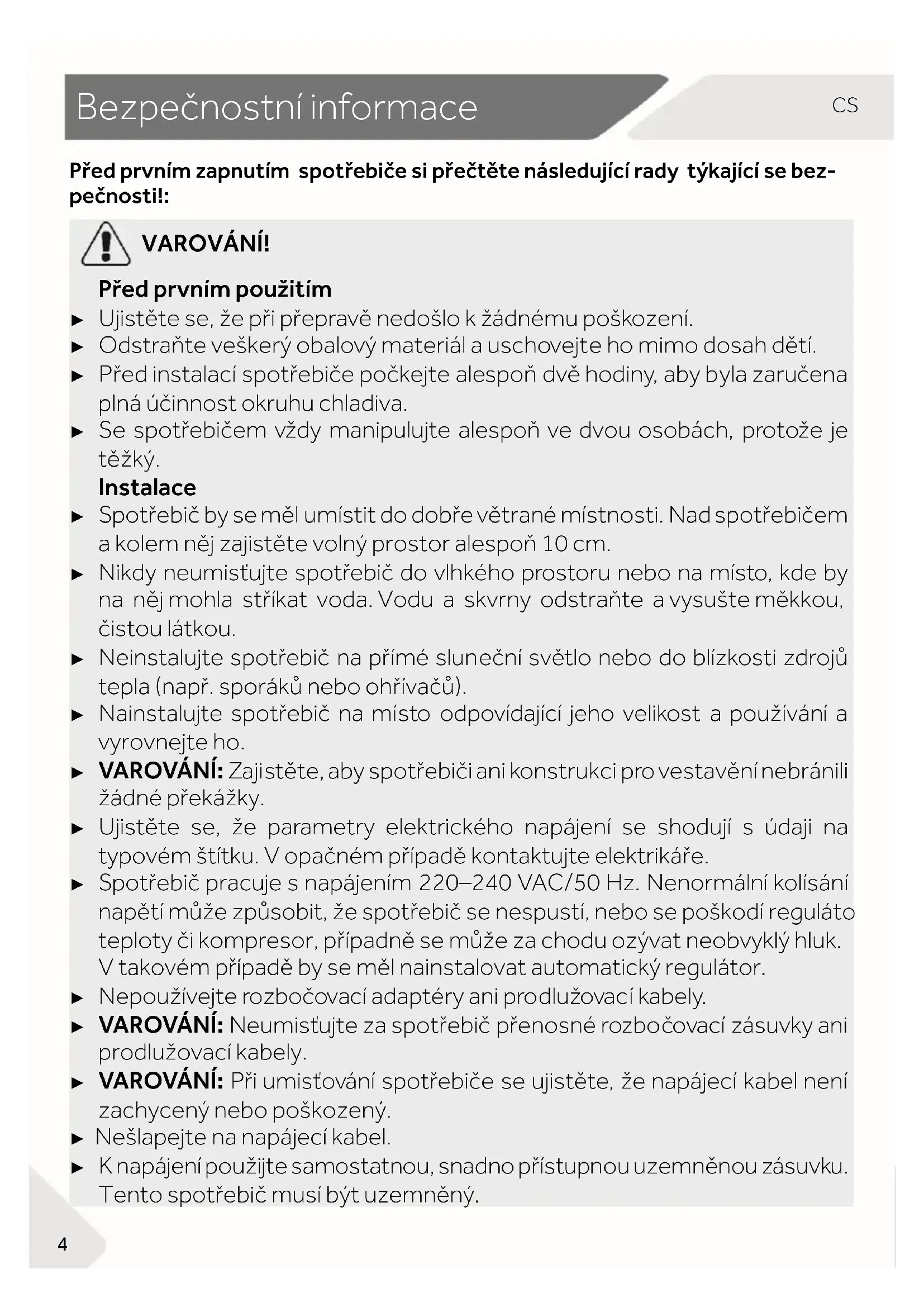 VAROVÁNÍ! Před prvním použitím ► Ujistěte se, že při přepravě nedošlo k žádnému poškození. ► Odstraňte veškerý obalový materiál a uschovejte ho mimo dosah dětí. ► Před instalací spotřebiče počkejte alespoň dvě hodiny, aby byla zaručena plná účinnost okruhu chladiva. ► Se spotřebičem vždy manipulujte alespoň ve dvou osobách, protože je těžký. Instalace ► Spotřebič by se měl umístit do dobře větrané místnosti. Nad spotřebičem a kolem něj zajistěte volný prostor alespoň 10 cm. ► Nikdy neumisťujte spotřebič do vlhkého prostoru nebo na místo, kde by na něj mohla stříkat voda. Vodu a skvrny odstraňte a vysušte měkkou, čistou látkou. ► Neinstalujte spotřebič na přímé sluneční světlo nebo do blízkosti zdrojů tepla (např. sporáků nebo ohřívačů). ► Nainstalujte spotřebič na místo odpovídající jeho velikost a používání a vyrovnejte ho. ► VAROVÁNÍ: Zajistěte, aby spotřebiči ani konstrukci pro vestavění nebránili žádné překážky. ► Ujistěte se, že parametry elektrického napájení se shodují s údaji na typovém štítku. V opačném případě kontaktujte elektrikáře. ► Spotřebič pracuje s napájením 220–240 VAC/50 Hz. Nenormální kolísání napětí může způsobit, že spotřebič se nespustí, nebo se poškodí regulátor teploty či kompresor, případně se může za chodu ozývat neobvyklý hluk. V takovém případě by se měl nainstalovat automatický regulátor. ► Nepoužívejte rozbočovací adaptéry ani prodlužovací kabely. ► VAROVÁNÍ: Neumisťujte za spotřebič přenosné rozbočovací zásuvky ani prodlužovací kabely. ► VAROVÁNÍ: Při umisťování spotřebiče se ujistěte, že napájecí kabel není zachycený nebo poškozený. ► Nešlapejte na napájecí kabel. ► K napájení použijte samostatnou, snadno přístupnou uzemněnou zásuvku. Tento spotřebič musí být uzemněný.5