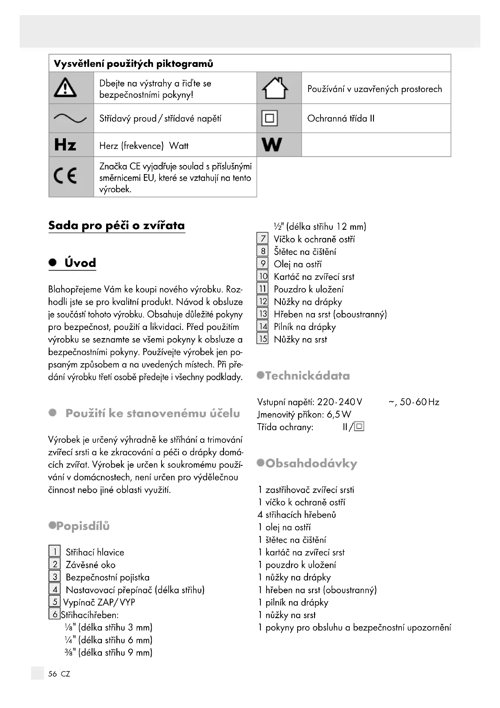 , 50 - 60 Hz Jmenovitý příkon: 6,5 W Třída ochrany: II / Obsah dodávky 1zastřihovač zvířecí srsti 1víčko kochraně ostří 4střihacích hřebenů 1olej na ostří 1 štětec na čištění 1kartáč na zvířecí srst 1pouzdro kuložení 1nůžky na drápky 1hřeben na srst (oboustranný) 1pilník na drápky 1nůžky na srst 1 pokyny pro obsluhu a bezpečnostní upozornění57 CZ Bezpečnostní pokyny