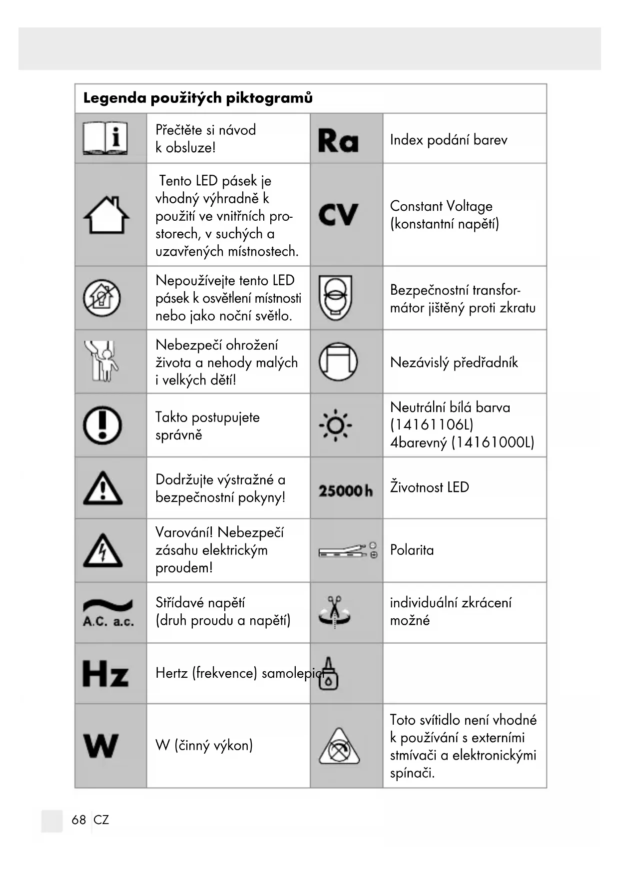 Šňůrový vypínač Technická data Model č.: 14161000L/14161106L LED pásek: Provozní napětí: 230 – 240 V∼ 50 Hz Třída ochrany: II/ Krytí: IP20 Jmenovitý výkon: 14161000L: max. 6,5 W, 96 LED, max. délka 3 m 14161106L: max. 6 W, 90 LED, max. délka 3 m Pouze pro 14161106L: Tento výrobek obsahuje světelné zdroje třídy energetické účinnosti „F“ (třída energetické účinnosti podle nařízení (EU) 2019/2015). Bezpečnost Bezpečnostní pokyny Při škodách způsobených nedodržením tohoto návodu k obsluze zaniká záruka! Za následné škody se neručí! Za věcné nebo osobní škody, způsobené neod- borným zacházením nebo nerespektováním bezpečnostních pokynů, se neručí!