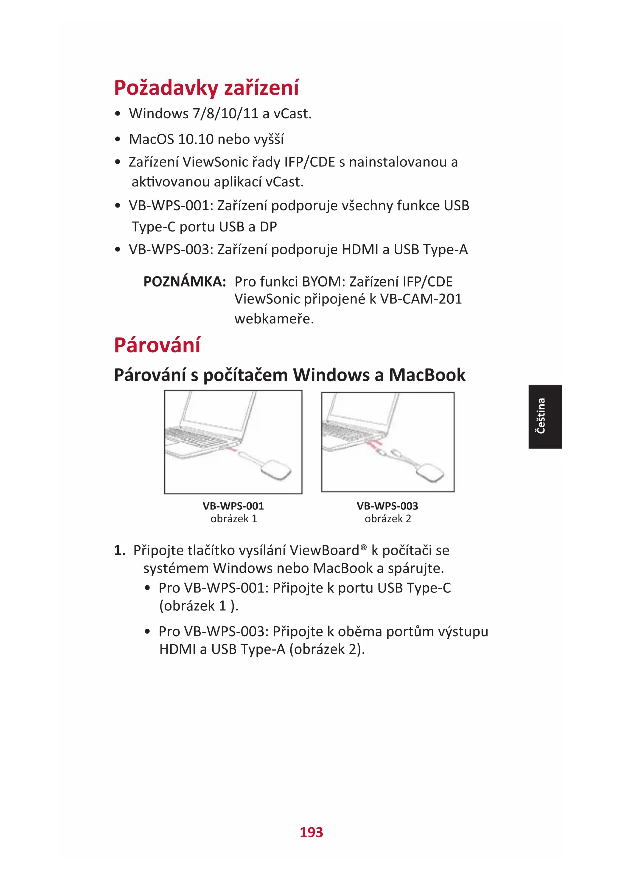 - Pro VB-WPS-003: Připojte k oběma portům výstupu HDMI a USB Type-A (obrázek 2). Čeština194