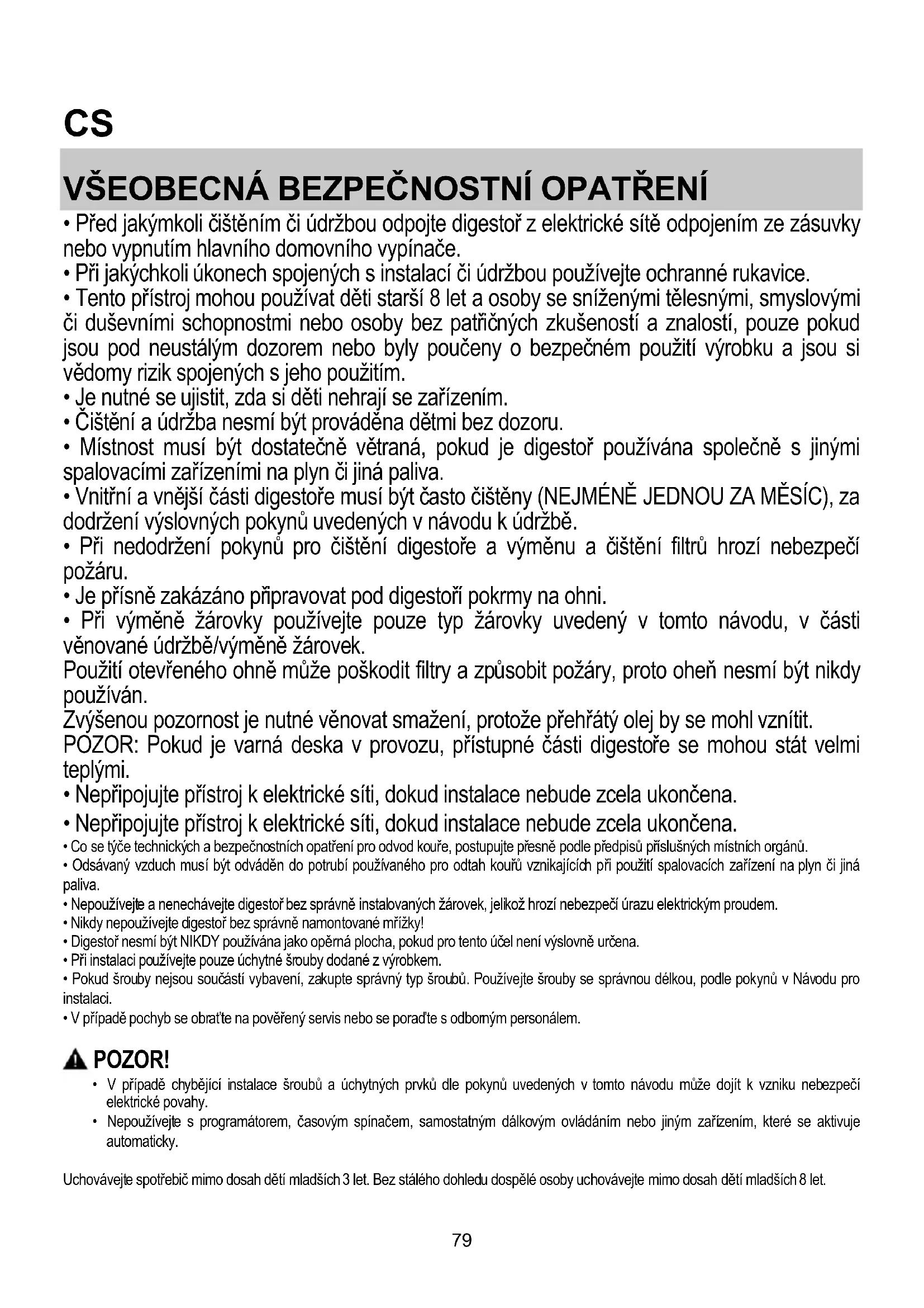 - Digestoř nesmí být NIKDY používána jako opěrná plocha, pokud pro tento účel není výslovně určena.
