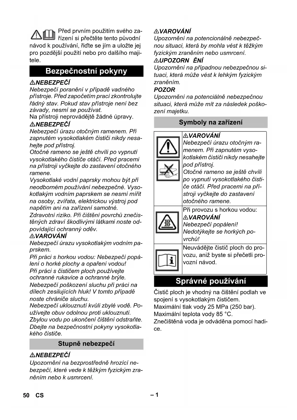 6.371-011.0 Hosszabbító tömlő 4.441-040.0 Segítség üzemzavar esetén 49HU– 1 Před prvním použitím svého za- řízení si přečtěte tento původní návod k používání, řiďte se jím a uložte jej pro pozdější použití nebo pro dalšího maji- tele. NEBEZPEČÍ Nebezpečí poranění v případě vadného přístroje. Před započetím prací zkontrolujte řádný stav. Pokud stav přístroje není bez závady, nesmí se používat. Na přístroji neprovádějtě žádné úpravy. NEBEZPEČÍ Nebezpečí úrazu otočným ramenem. Při zapnutém vysokotlakém čističi nikdy nesa- hejte pod přístroj. Otočné rameno se ještě chvíli po vypnutí vysokotlakého čističe otáčí. Před pracemi na přístroji vyčkejte do zastavení otočného ramene. Vysokotlaké vodní paprsky mohou být při neodborném používání nebezpečné. Vyso- kotlakým vodním paprskem se nesmí mířit na osoby, zvířata, elektrickou výstroj pod napětím ani na zařízení samotné. Zdravotní riziko. Při čištění povrchů znečis- těných zdraví škodlivými látkami noste od- povídající ochranný oděv. 몇 VAROVÁNÍ Nebezpečí úrazu vysokotlakým vodním pa- prskem. Při práci s horkou vodou: Nebezpečí popá- lení o horké plochy a opaření vodou! Při práci s čističem ploch používejte ochranné rukavice a ochranné brýle. Nebezpečí poškození sluchu při práci na dílech zesilujících hluk! V tomto případě noste chrániče sluchu. Nebezpečí uklouznutí kvůli zbylé vodě. Po- užívejte obuv odolnou proti uklouznutí. Zbylou vodu po ukončení čištění odstraňte. Dbejte na bezpečnostní pokyny vysokotla- kého čističe. NEBEZPEČÍ Upozornění na bezprostředně hrozící ne- bezpečí, které vede k těžkým fyzickým zra- něním nebo k usmrcení. 몇 VAROVÁNÍ Upozornění na potencionálně nebezpeč- nou situaci, která by mohla vést k těžkým fyzickým zraněním nebo usmrcení. 몇 UPOZORN ĚNÍ Upozornění na případnou nebezpečnou si- tuaci, která může vést k lehkým fyzickým zraněním. POZOR Upozornění na potenciálně nebezpečnou situaci, která může mít za následek poško- zení majetku. Čistič ploch je vhodný na čištění podlah ve spojení s vysokotlakým čističem. Maximální tlak vody 25 MPa (250 bar). Maximální teplota vody 85 °C. Znečištěná voda je odváděna pomocí hadi- ce. Bezpečnostní pokyny Stupně nebezpečí Symboly na zařízení 몇 VAROVÁNÍ Nebezpečí úrazu otočným ra- menem. Při zapnutém vyso- kotlakém čističi nikdy nesahejte pod přístroj. Otočné rameno se ještě chvíli po vypnutí vysokotlakého čisti- če otáčí. Před pracemi na pří- stroji vyčkejte do zastavení otočného ramene. Při provozu s horkou vodou: 몇 VAROVÁNÍ Nebezpečí popálení! Nedotýkejte se horkých po- vrchů! Neuvádějte čistič ploch do pro- vozu, aniž byste si přečetli pro- vozní návod. Správné používání 50 CS– 2 Obalové materiály jsou recyklovatel- né. Obal nezahazujte do domácího odpadu, nýbrž jej odevzdejte k opětovné- mu zužitkování. Přístroj je vyroben z hodnotných recyklovatelných materiálů, které se dají dobře znovu využít. Likvidujte proto staré přístroje ve sběrnách k tomuto účelu určených. Informace o obsažených látkách (RE- ACH) Aktuální informace o obsažených látkách naleznete na adrese: www.kaercher.com/REACH Aby byl možný bezporuchový provoz vyso- kotlakého čističe, je nutné používat vhodné vysokotlaké trysky. Upozornění: Požadované svazky trysek jsou koncipová- ny pro odpovídající vysokotlaký čistič a musí být objednány zvlášť. Obrázek 1, viz přebal 1 Velikost trysky (příklad) Velikost trysky lze zjistit na typovém štítku vysokotlakého čističe. V tabulce zvolte sadu trysek vhodnou pro vysokotlaký čistič. Obrázek 2, viz přebal 1 Těsnění 2 Otočné rameno 3 Tryska 4 Převlečná matice Těsnění vložte do drážky otočného ra- mene. Nasaďte trysku. Trysku zlehka zašroubujte převlečnou maticí. Upozornění: Výstupní paprsek musí být namířen para- lelně k otočnému rameni. Obrázek 3, viz přebal Klíčovou plochu trysku (velikost klíče