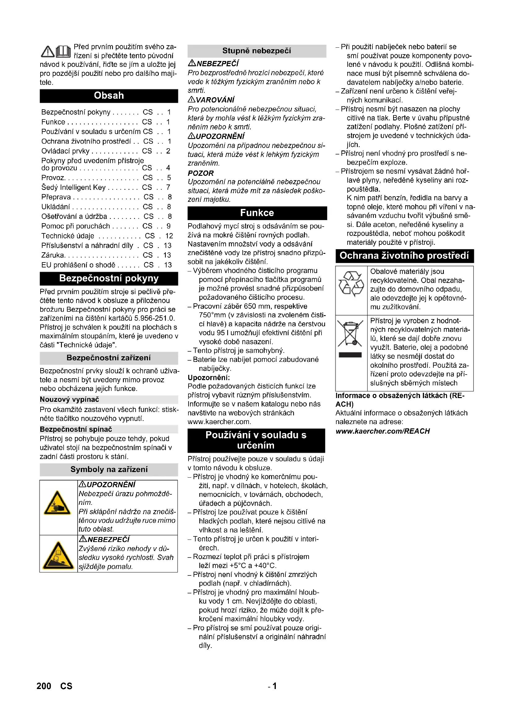 Chairman of the Board of Management Director Regulatory Affairs & Certification 199HU- 1 Před prvním použitím svého za- řízení si přečtěte tento původní návod k používání, řiďte se jím a uložte jej pro pozdější použití nebo pro dalšího maji- tele. Před prvním použitím stroje si pečlivě pře- čtěte tento návod k obsluze a přiloženou brožuru Bezpečnostní pokyny pro práci se zařízeními na čištění kartáčů 5.956-251.0. Přístroj je schválen k použití na plochách s maximálním stoupáním, které je uvedeno v části "Technické údaje". Bezpečnostní prvky slouží k ochraně uživa- tele a nesmí být uvedeny mimo provoz nebo obcházena jejich funkce. Pro okamžité zastavení všech funkcí: stisk- něte tlačítko nouzového vypnutí. Přístroj se pohybuje pouze tehdy, pokud uživatel stojí na bezpečnostním spínači v zadní části prostoru k stání. NEBEZPEČÍ Pro bezprostředně hrozící nebezpečí, které vede k těžkým fyzickým zraněním nebo k smrti. 몇 VAROVÁNÍ Pro potencionálně nebezpečnou situaci, která by mohla vést k těžkým fyzickým zra- něním nebo k smrti. 몇 UPOZORNĚNÍ Upozornění na případnou nebezpečnou si- tuaci, která může vést k lehkým fyzickým zraněním. POZOR Upozornění na potenciálně nebezpečnou situaci, která může mít za následek poško- zení majetku. Podlahový mycí stroj s odsáváním se pou- žívá na mokré čištění rovných podlah. Nastavením množství vody a odsávání znečištěné vody lze přístroj snadno přizpů- sobit na jakékoliv čištění. – Výběrem vhodného čisticího programu pomocí přepínacího tlačítka programů je možné provést snadné přizpůsobení požadovaného čišticího procesu. – Pracovní záběr 650 mm, respektive 750°mm (v závislosti na zvoleném čisti- cí hlavě) a kapacita nádrže na čerstvou vodu 95 l umožňují efektivní čištění při vysoké době nasazení. – Tento přístroj je samohybný. – Baterie lze nabíjet pomocí zabudované nabíječky. Upozornění: Podle požadovaných čisticích funkcí lze přístroj vybavit různým příslušenstvím. Informujte se v našem katalogu nebo nás navštivte na webových stránkách www.kaercher.com. Přístroj používejte pouze v souladu s údaji v tomto návodu k obsluze. – Přístroj je vhodný ke komerčnímu pou- žití, např. v dílnách, v hotelech, školách, nemocnicích, v továrnách, obchodech, úřadech a půjčovnách. – Přístroj lze používat pouze k čištění hladkých podlah, které nejsou citlivé na vlhkost a na leštění. – Tento přístroj je určen k použití v interi- érech. – Rozmezí teplot při práci s přístrojem leží mezi +5°C a +40°C. – Přístroj není vhodný k čištění zmrzlých podlah (např. v chladírnách). – Přístroj je vhodný pro maximální hloub- ku vody 1 cm. Nevjíždějte do oblasti, pokud hrozí riziko, že může dojít k pře- kročení maximální hloubky vody. – Pro přístroj se smí používat pouze origi- nální příslušenství a originální náhradní díly. – Při použití nabíječek nebo baterií se smí používat pouze komponenty povo- lené v návodu k použití. Odlišná kombi- nace musí být písemně schválena do- davatelem nabíječky a/nebo baterie. – Zařízení není určeno k čištění veřej- ných komunikací. – Přístroj nesmí být nasazen na plochy citlivé na tlak. Berte v úvahu přípustné zatížení podlahy. Plošné zatížení pří- strojem je uvedené v technických úda- jích. – Přístroj není vhodný pro prostředí s ne- bezpečím exploze. – Přístrojem se nesmí vysávat žádné hoř- lavé plyny, neředěné kyseliny ani roz- pouštědla. K nim patří benzín, ředidla na barvy a topné oleje, které mohou při víření v na- sávaném vzduchu tvořit výbušné smě- si. Dále aceton, neředěné kyseliny a rozpouštědla, neboť mohou poškodit materiály použité v přístroji. Informace o obsažených látkách (RE- ACH) Aktuální informace o obsažených látkách naleznete na adrese: www.kaercher.com/REACH Obsah Bezpečnostní pokyny . . . . . . . CS . . 1 Funkce . . . . . . . . . . . . . . . . . . CS . . 1 Používání v souladu s určením CS . . 1 Ochrana životního prostředí . . CS . . 1 Ovládací prvky . . . . . . . . . . . . CS . . 2 Pokyny před uvedením přístroje do provozu . . . . . . . . . . . . . . . CS . . 4 Provoz. . . . . . . . . . . . . . . . . . . CS . . 5 Šedý Intelligent Key . . . . . . . . CS . . 7 Přeprava . . . . . . . . . . . . . . . . . CS . . 8 Ukládání . . . . . . . . . . . . . . . . . CS . . 8 Ošetřování a údržba . . . . . . . . CS . . 8 Pomoc při poruchách . . . . . . . CS . . 9 Technické údaje . . . . . . . . . . . CS . 12 Příslušenství a náhradní díly . CS . 13 Záruka. . . . . . . . . . . . . . . . . . . CS . 13 EU prohlášení o shodě . . . . . . CS . 13 Bezpečnostní pokyny Bezpečnostní zařízení Nouzový vypínač Bezpečnostní spínač Symboly na zařízení 몇 UPOZORNĚNÍ Nebezpečí úrazu pohmoždě- ním. Při sklápění nádrže na znečiš- těnou vodu udržujte ruce mimo tuto oblast. NEBEZPEČÍ Zvýšené riziko nehody v dů- sledku vysoké rychlosti. Svah sjíždějte pomalu. Stupně nebezpečí Funkce Používání v souladu s určením Ochrana životního prostředí Obalové materiály jsou recyklovatelné. Obal nezaha- zujte do domovního odpadu, ale odevzdejte jej k opětovné- mu zužitkování. Přístroj je vyroben z hodnot- ných recyklovatelných materiá- lů, které se dají dobře znovu využít. Baterie, olej a podobné látky se nesmějí dostat do okolního prostředí. Použitá za- řízení proto odevzdejte na pří- slušných sběrných místech 200 CS- 2 1 Volant 2 Plnicí systém 3 Uzávěr nádrže na znečištěnou vodu 4 Víko nádrže na špinavou vodu 5 Ochranné s