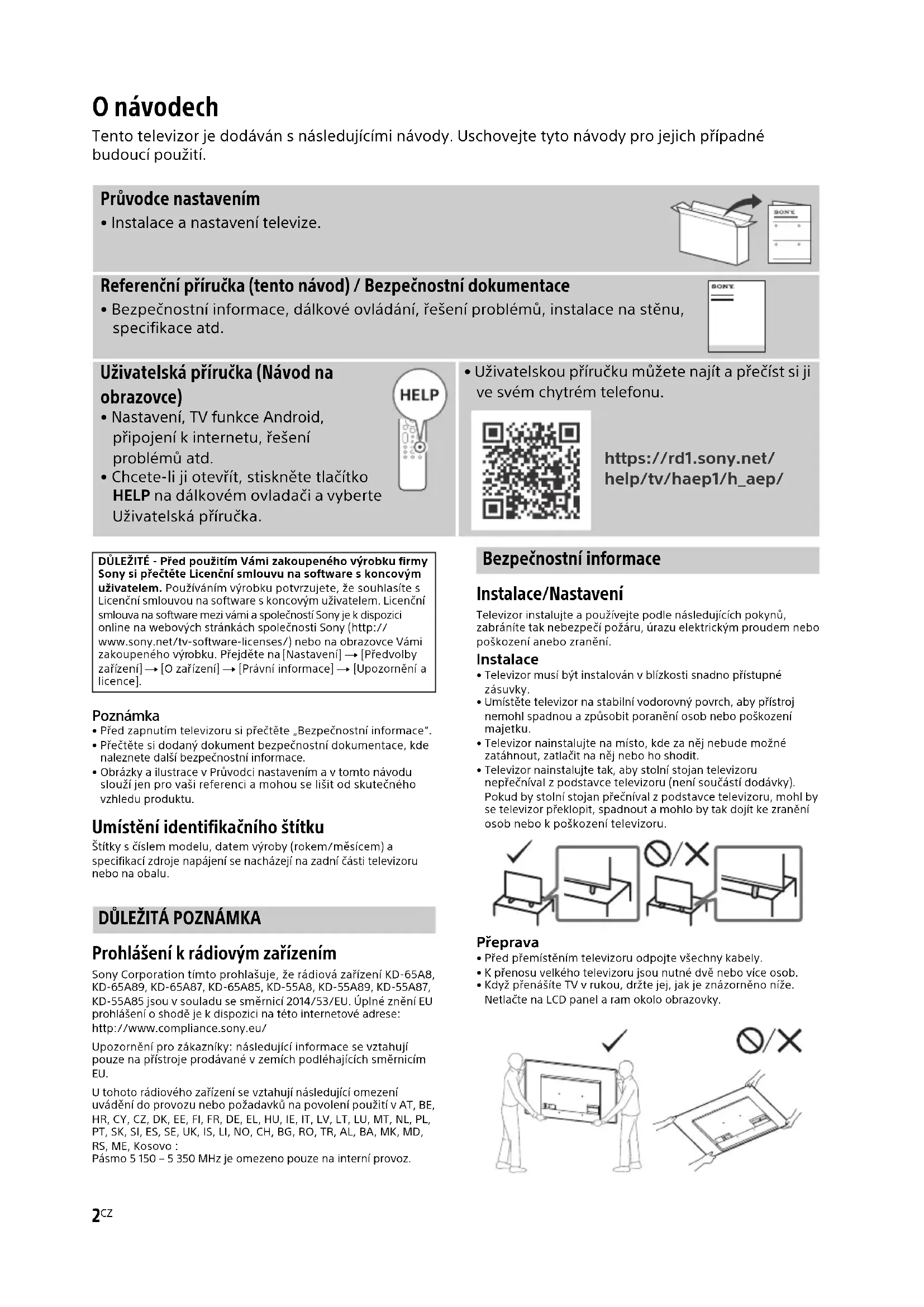 Sony Corporation timto prohlasej, ze radiova zaifzeni KD-65AB, KD-65A89, KD-65A87, KD-65A85, KD-55A8, KD-55A89, KD-55A87, KD-55A85 jsou v souladu se smernici 2014/53/EU. Upnne zneni EU prohlaseni o shode je k disposzici na tefo internetovo adrese: http://www.compliance.sony.eu/
