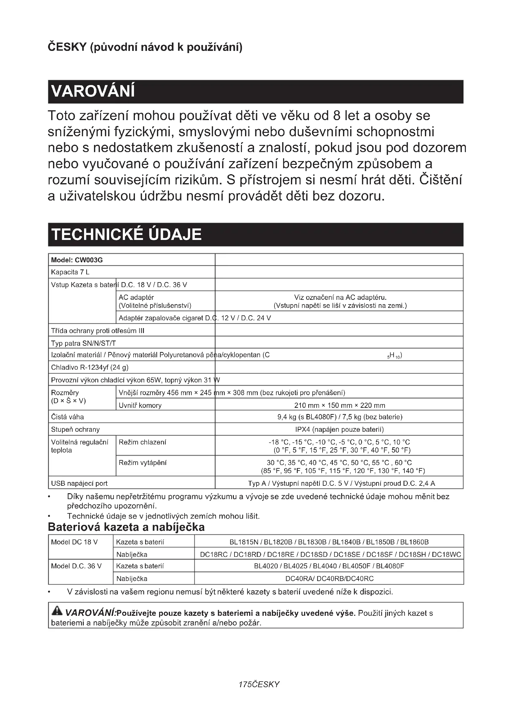 - Pôvodná batéria a nabíjačka Makita. POZN.: Niektoré položky na tomto zozname môžu byť súčasťou balenia ako štandardné príslušenstvo. To sa v jednotlivých krajinách môže líšiť.175 ČESKY ČESKY (původní návod k používání) VAROVÁNÍ Toto zařízení mohou používat děti ve věku od 8 let a osoby se sníženými fyzickými, smyslovými nebo duševními schopnostmi nebo s nedostatkem zkušeností a znalostí, pokud jsou pod dozorem nebo vyučované o používání zařízení bezpečným způsobem a rozumí souvisejícím rizikům. S přístrojem si nesmí hrát děti. Čištění a uživatelskou údržbu nesmí provádět děti bez dozoru. TECHNICKÉ ÚDAJE Model: CW003GKapacita 7 LVstup Kazeta s baterií D.C. 18 V / D.C. 36 VAC adaptér (Volitelné příslušenství)Viz označení na AC adaptéru. (Vstupní napětí se liší v závislosti na zemi.)Adaptér zapalovače cigaret D.C. 12 V / D.C. 24 VTřída ochrany proti otřesům IIITyp patra SN/N/ST/TIzolační materiál / Pěnový materiál Polyuretanová pěna/cyklopentan (C