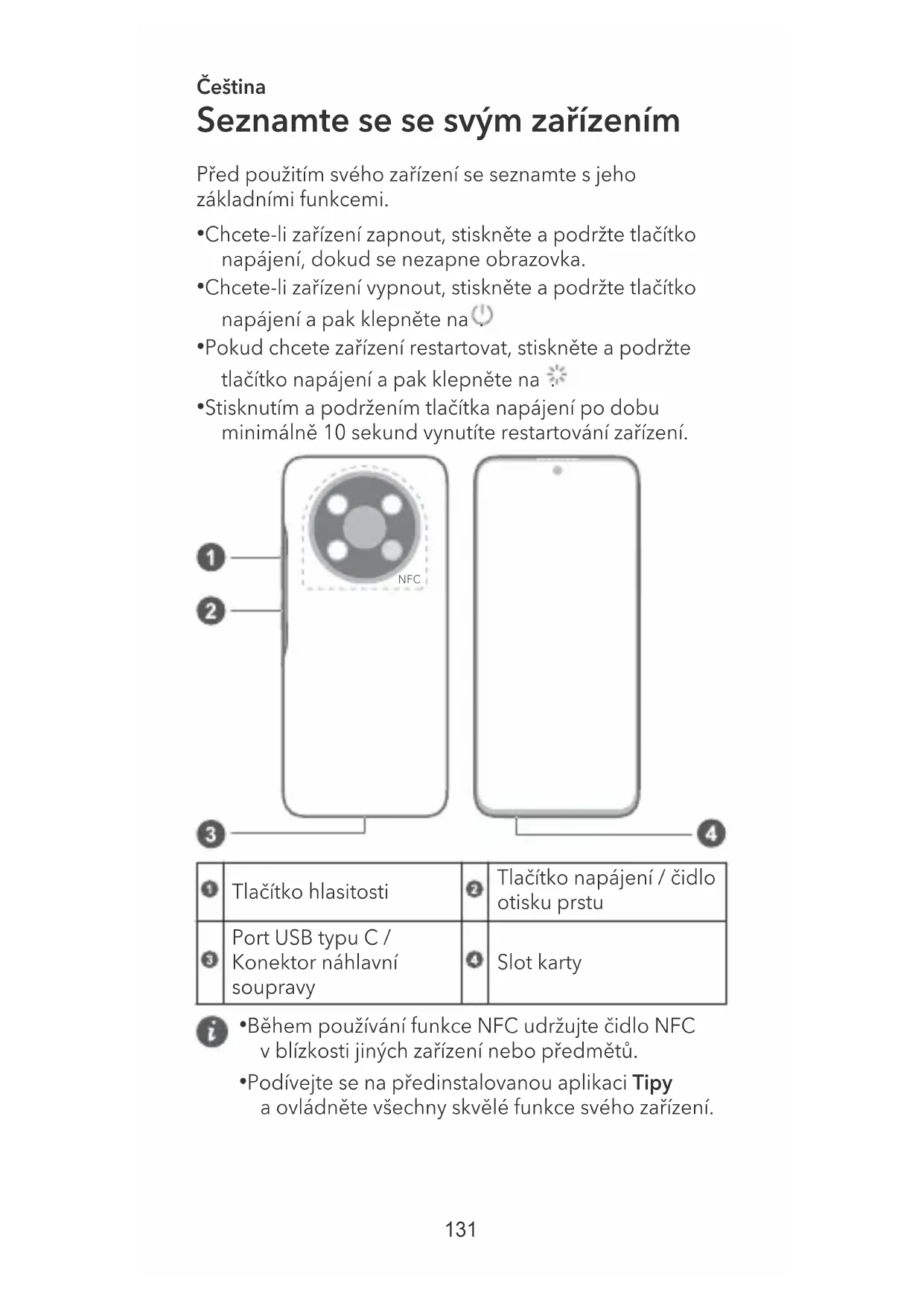 - Stisknutím a podržením tlačítka napájení po dobu minimálně 10 sekund vynutíte restartování zařízení. NFC Tlačítko hlasitosti Tlačítko napájení / čidlo otisku prstu Port USB typu C / Konektor náhlavní soupravy Slot karty