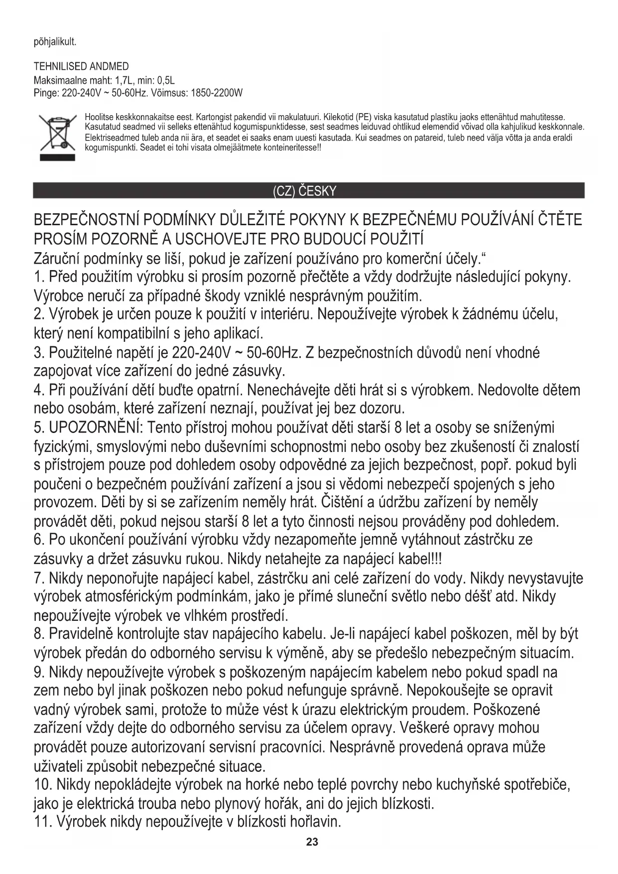 POKROČILÝ PROVOZ: Usazeniny vodního kamene uvnitř konvice by měly být pravidelně odstraňovány. Na tuto operaci se nevztahuje záruční servis. Nedostatek Napětí: 220-240V ~ 50-60Hz. Výkon: 1850-2200W TECHNICKÁ DATA Maximální kapacita: 1,7L, min.: 0,5L Ochrana životního prostředí. Kartón odevzdejte do sběru. Polyetylénové sáčky (PE) vyhazujte do kontejneru na plasty. Vysloužilý přístroj odevzdejte do příslušného sběrného dvoru, protože některé části zařízení mohou představovat pro životní prostředí nebezpečí. Elektrický přístroj odevzdejte tak, aby se omezilo jeho opětovné používání. Pokud jsou v přístroji baterie, vyjměte je a odevzdejte do příslušného sběrného místa zvlášť. Přístroj nevyhazujte do popelnic ani kontejneru na směsný odpad!!26
