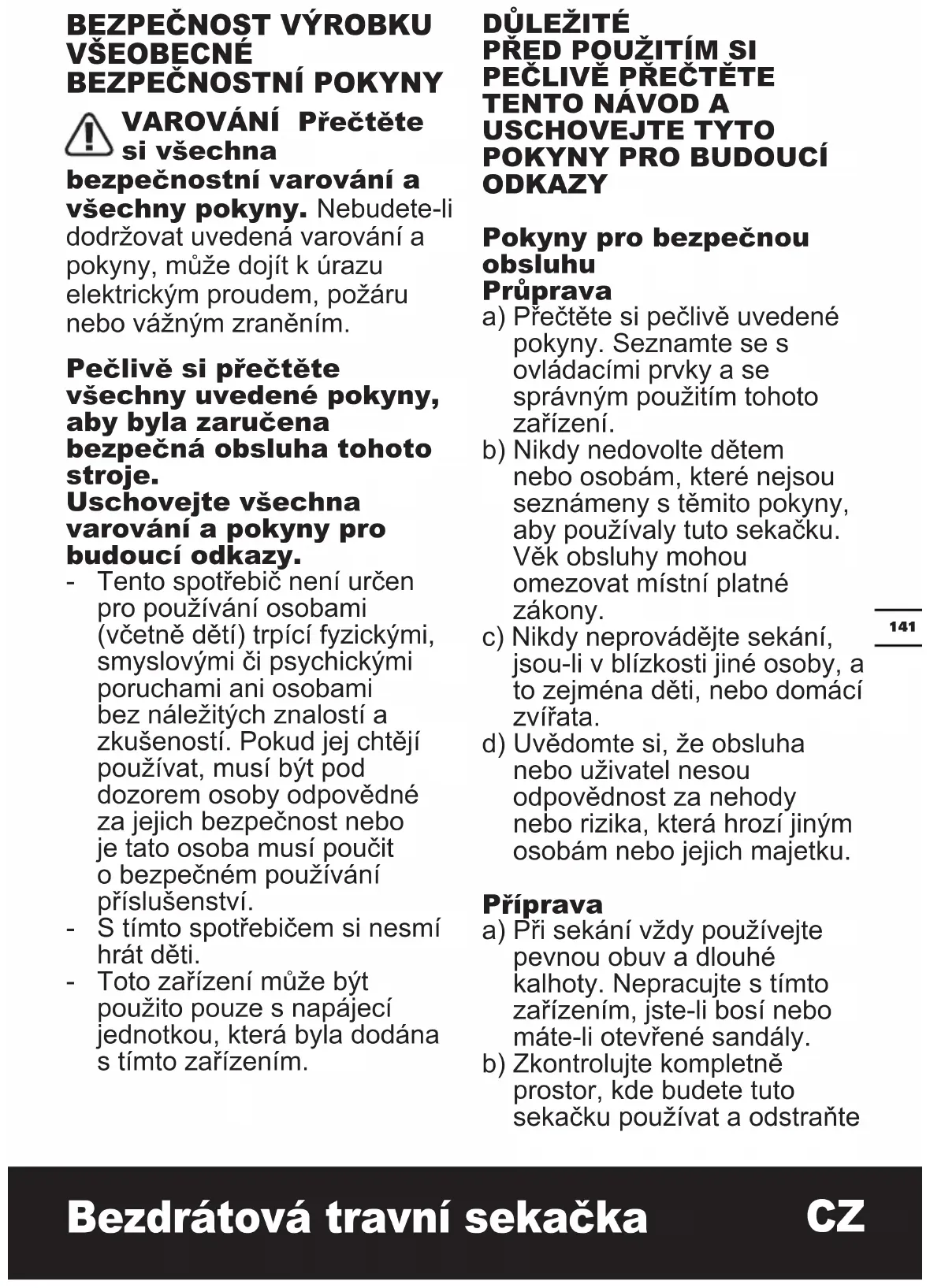 ODKAZY Pokyny pro bezpečnou obsluhu Průprava a) Přečtěte si pečlivě uvedené pokyny. Seznamte se s ovládacími prvky a se správným použitím tohoto zařízení. b) Nikdy nedovolte dětem nebo osobám, které nejsou seznámeny s těmito pokyny, aby používaly tuto sekačku. Věk obsluhy mohou omezovat místní platné zákony. c) Nikdy neprovádějte sekání, jsou-li v blízkosti jiné osoby, a to zejména děti, nebo domácí zvířata. d) Uvědomte si, že obsluha nebo uživatel nesou odpovědnost za nehody nebo rizika, která hrozí jiným osobám nebo jejich majetku. Příprava a) Při sekání vždy používejte pevnou obuv a dlouhé kalhoty. Nepracujte s tímto zařízením, jste-li bosí nebo máte-li otevřené sandály. b) Zkontrolujte kompletně prostor, kde budete tuto sekačku používat a odstraňte142 Bezdrátová travní sekačka