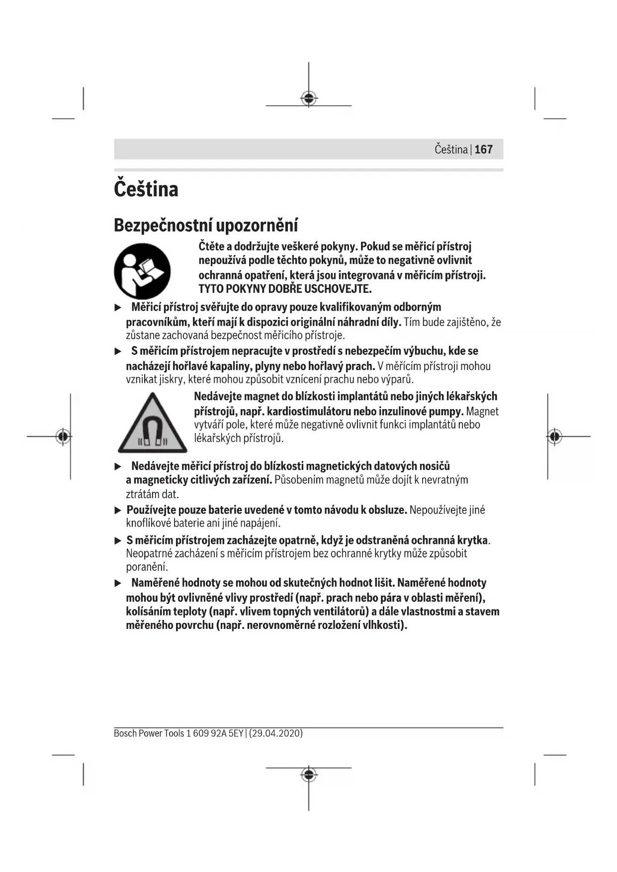 Baterie 3 x 1,5 V LR03 (AAA) Provozní doba cca 10h Hmotnost podle EPTA-Procedure 01:2014 0,16kg Rozměry 187×56×44mm A) Při provozní teplotě 25°C B) Vyskytuje se pouze nevodivé znečištění, přičemž příležitostně se ale očekává dočasná vodivost způsobená orosením. Nechte měřicí přístroj aklimatizovat apřed měřením odstraňte zhrotů orosení. Kjednoznačné identifikaci měřicího přístroje slouží sériové číslo(8) na typovém štítku. Montáž Vložení/výměna baterií Pro provoz měřicího přístroje doporučujeme použít alkalicko-manganové baterie. Pro otevření přihrádky na baterie stáhněte kryt přihrádky pro baterie (9). Vložte baterie. Přitom dodržujte správnou polaritu podle vyobrazení na vnitřní straně přihrádky baterie. Vždy vyměňujte všechny baterie současně. Používejte pouze baterie od jednoho výrobce ase stejnou kapacitou. Tip: Pro jednoduché vyjmutí baterií zatáhněte za pásek vpřihrádce pro baterie. Znovu zasuňte kryt přihrádky pro baterie (9). 1 609 92A 5EY | (29.04.2020) Bosch Power ToolsČeština | 171 u Když měřicí přístroj delší dobu nepoužíváte, vyjměte zněj baterie. Při delším skladování vměřicím přístroji mohou baterie zkorodovat asamy se vybít. Ukazatel baterie na displeji Následující tabulka ukazuje souvislost mezi kapacitou/ dobrou provozu baterií aukazatelem stavu nabití (e) na displeji (3). Ukazatel Kapacita/doba provozu 75%až100% 50%až75% 25%až50% <25% ≤15minut provozu Když symbol baterie bliká, už není možné měřit. Vyměňte baterie. Provoz Uvedení do provozu u Chraňte měřicí přístroj před vlhkem apřímým slunečním zářením. u Nevystavujte měřicí přístroj extrémním teplotám nebo kolísání teplot. Nenechávejte ho např. delší dobu ležet vautě. Při větším kolísání teplot nechte měřicí přístroj nejprve vytemperovat, než ho uvedete do provozu. Při extrémních teplotách nebo teplotních výkyvech může být omezena přesnost přístroje. u Dbejte na dostatečnou aklimatizaci měřicího přístroje. Při silném kolísání teplot může doba aklimatizace trvat až 30minut. Může tomu tak být např. tehdy, když nejprve provádíte měření ve studeném sklepě apoté na teplé půdě. u Zabraňte prudkým nárazům nebo pádu měřicího přístroje. Po působení silných vnějších vlivů apři neobvyklém chování funkcí byste měli nechat měřicí přístroj zkontrolovat vautorizovaném servisu Bosch. Tip: Nalepte přiložené nálepky se skupinami dřeva apříslušnými druhy dřeva vpožadovaném jazyce na kryt přihrádky pro baterie (9). Zapnutí avypnutí Pro zapnutí měřicího přístroje stiskněte tlačítko zapnutí/vypnutí/přidržení (1) nebo tlačítko pro výběr skupin dřeva (2). Na displeji (3) se na 2sekundy zobrazí teplota Bosch Power Tools 1 609 92A 5EY | (29.04.2020)172 | Čeština prostředí ana řádku (a) blikají symboly výběru skupin dřevaA aB. Po prvním uvedení do provozu je přednastavená skupina dřevaA. Pro vypnutí měřicího přístroje podržte cca 1,5sekundy stisknuté tlačítko zapnutí/ vypnutí/přidržení (1). Po opětovném zapnutí je vměřicím přístroji přednastavená naposledy zvolená skupina dřeva. Po 5minutách nečinnosti od posledního měření nebo posledního stisknutí tlačítka se měřicí přístroj automaticky vypne kvůli šetření baterií. Příprava měření Nastavení skupiny dřeva Pro optimální výsledky měření se musí před každým měřením nastavit skupina dřeva. Tlačítkem (2) zvolte vhodnou skupinu dřeva. Zvolená skupina dřeva se zobrazí na displeji (3). Tip: Pokud dřevo, které používáte, není ani vjedné ze dvou skupin dřeva, nebo nevíte, kterému druhu dřeva se vámi používané dřevo nejvíce podobá, použijte skupinu dřevaA. Ta obecně zobrazuje vyšší hodnotu. Tak si můžete být jistí, že nebudete dřevo zpracovávat příliš brzy nebo příliš vlhké. Při vypnutí měřicího přístroje se nastavená skupina dřeva uloží. Po opětovném zapnutí je vměřicím přístroji přednastavená naposledy zvolená skupina dřeva. Měřený objekt Místo ve dřevě, které se má měřit, by mělo být bez povrchové úpravy abez suků, nečistot, pryskyřice, hniloby ajiných vad. Povrch dřeva by neměl být chemicky ošetřený. Neprovádějte měření na čelních stranách, protože tam schne dřevo obzvláště rychle. Mohlo by to vést knesprávným výsledkům měření. Při měření vlhkosti upalivového materiálu je vhodné vzorek dřeva před měřením rozštípnout azměřit ve třech bodech. Měřicí body: vždy 5cm od levé apravé řezné hrany adále uprostřed polena (viz obrázek B). Proces měření Sejměte ochrannou krytku (6). Za tímto účelem mírně povytáhněte obě strany ochranné krytky (6). Ochrannou krytku upevněte na zadní straně měřicího přístroje (pomocí magnetů), viz obrázek na straně 3. Před měřením zajistěte, aby byla teplota prostředí shodná steplotou měřeného objektu. Vpřípadě potřeby počkejte, dokud se měřicí přístroj nepřizpůsobí teplotě prostředí. Měření vlhkosti provádějte minimálně 5cm od řezných hran, protože dřevo na kraji vysychá rychleji než uprostřed (viz obrázek B). 1 609 92A 5EY | (29.04.2020) Bosch Power ToolsČeština | 173 Neměřte na povrchu dřeva. Kvůli dešti nebo rose se zde může nahromadit voda, což může ovlivnit měření. Měřte vždy napříč kvláknům. Neměřte souběžně svlákny nebo podél letokruhů (viz obrázek A). Měření probíhá voblasti hloubky zapíchnutých hrotů (5). Optimálních výsledků měření je dosaženo, když se hroty zapíchnou do dřeva cca 4–5mm. Orientujte se podle zářezu na hrotech, který označuje hloubku 5mm. Pro spuštění měření zapíchněte hroty do dřeva. Pozor: Nepoužív