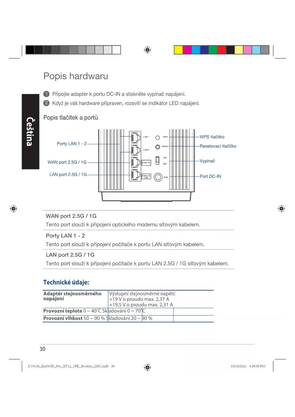 Připojte adaptér k portu DC-IN a stiskněte vypínač napájení. Když je váš hardware připraven, rozsvítí se indikátor LED napájení. Popis hardwaru Popis tlačítek a portů WAN port 2.5G / 1G Tento port slouží k připojení optického modemu síťovým kabelem. Porty LAN 1 - 2 Tento port slouží k připojení počítače k portu LAN síťovým kabelem. LAN port 2.5G / 1G Tento port slouží k připojení počítače k portu LAN 2.5G / 1G síťovým kabelem.Adaptér stejnosměrného napájeníVýstupní stejnosměrné napětí: +19 V o proudu max. 2,37 A+19,5 V o proudu max. 2,31 AProvozní teplota 0 ~ 40˚C Skladování 0 ~ 70˚CProvozní vlhkost 50 ~ 90 % Skladování 20 ~ 90 % Technické údaje: Porty LAN 1 - 2WAN port 2.5G / 1GLAN port 2.5G / 1GWPS tlačítkoResetovací tlačítkoVypínačPort DC-IN U19133_ZenWiFi_Pro_XT12_1PK_Booklet_QSG.indb 30U19133_ZenWiFi_Pro_XT12_1PK_Booklet_QSG.indb 30 10/26/2021 4:49:59 PM10/26/2021 4:49:59 PM31 Čeština Příprava instalace samostatného směrovače