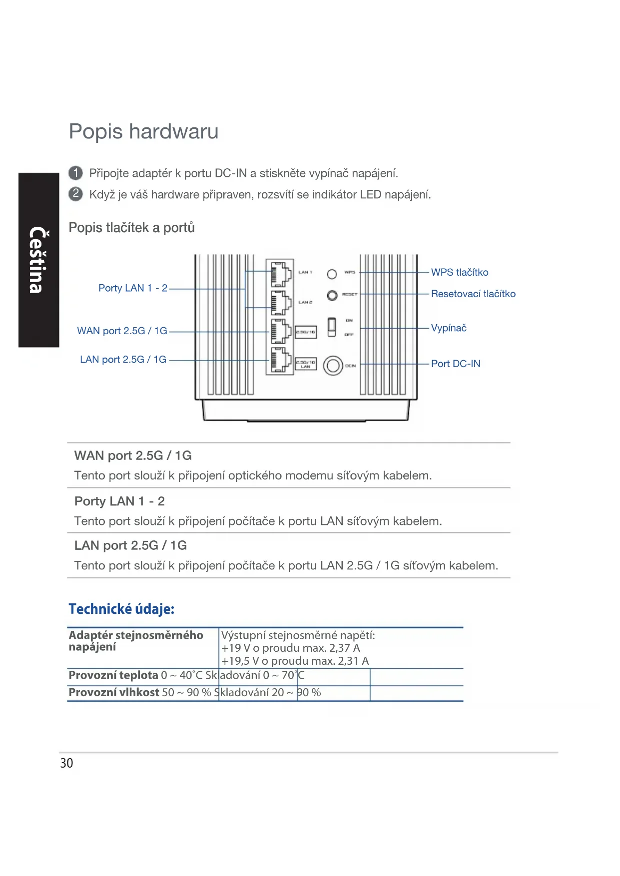 Připojte adaptér k portu DC-IN a stiskněte vypínač napájení. Když je váš hardware připraven, rozsvítí se indikátor LED napájení. Popis hardwaru Popis tlačítek a portů WAN port 2.5G / 1G Tento port slouží k připojení optického modemu síťovým kabelem. Porty LAN 1 - 2 Tento port slouží k připojení počítače k portu LAN síťovým kabelem. LAN port 2.5G / 1G Tento port slouží k připojení počítače k portu LAN 2.5G / 1G síťovým kabelem.Adaptér stejnosměrného napájeníVýstupní stejnosměrné napětí: +19 V o proudu max. 2,37 A+19,5 V o proudu max. 2,31 AProvozní teplota 0 ~ 40˚C Skladování 0 ~ 70˚CProvozní vlhkost 50 ~ 90 % Skladování 20 ~ 90 % Technické údaje: Porty LAN 1 - 2WAN port 2.5G / 1GLAN port 2.5G / 1GWPS tlačítkoResetovací tlačítkoVypínačPort DC-IN31 Čeština Příprava instalace samostatného směrovače