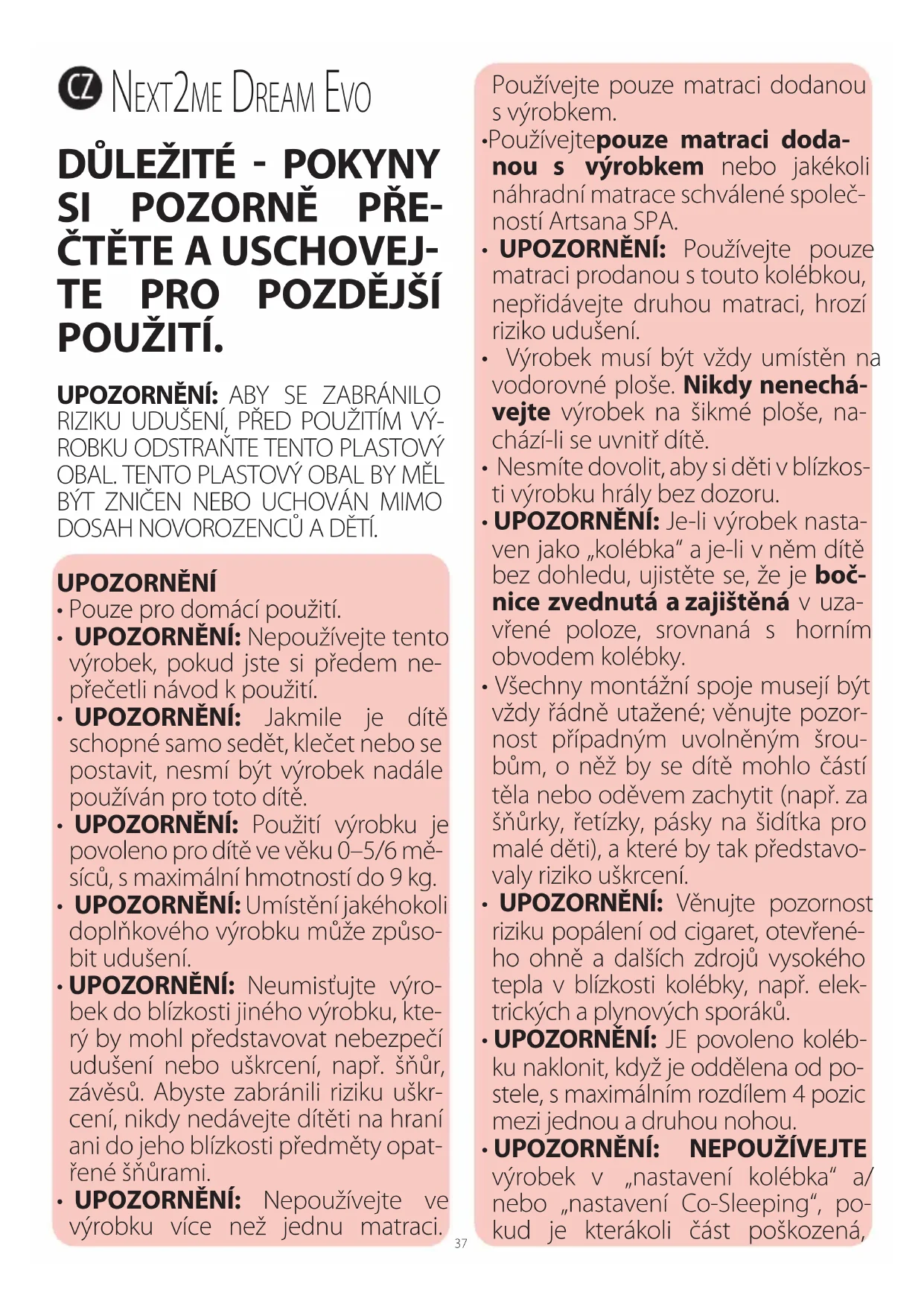 UPOZORNENI: Je-li vyrobek po-uzivan v „nastaveni Co-Sleeping (pripevní k posteli)“, pred ulozením dítěte se ujistěte, ze spojo-vací popruhy jsou zaháknute a správně napnute; vyrobek musí byt pripevněk matraci rodičú bez mezer mezi nejnižsí Častí systému Co-Sleeping a matrací rodičú.