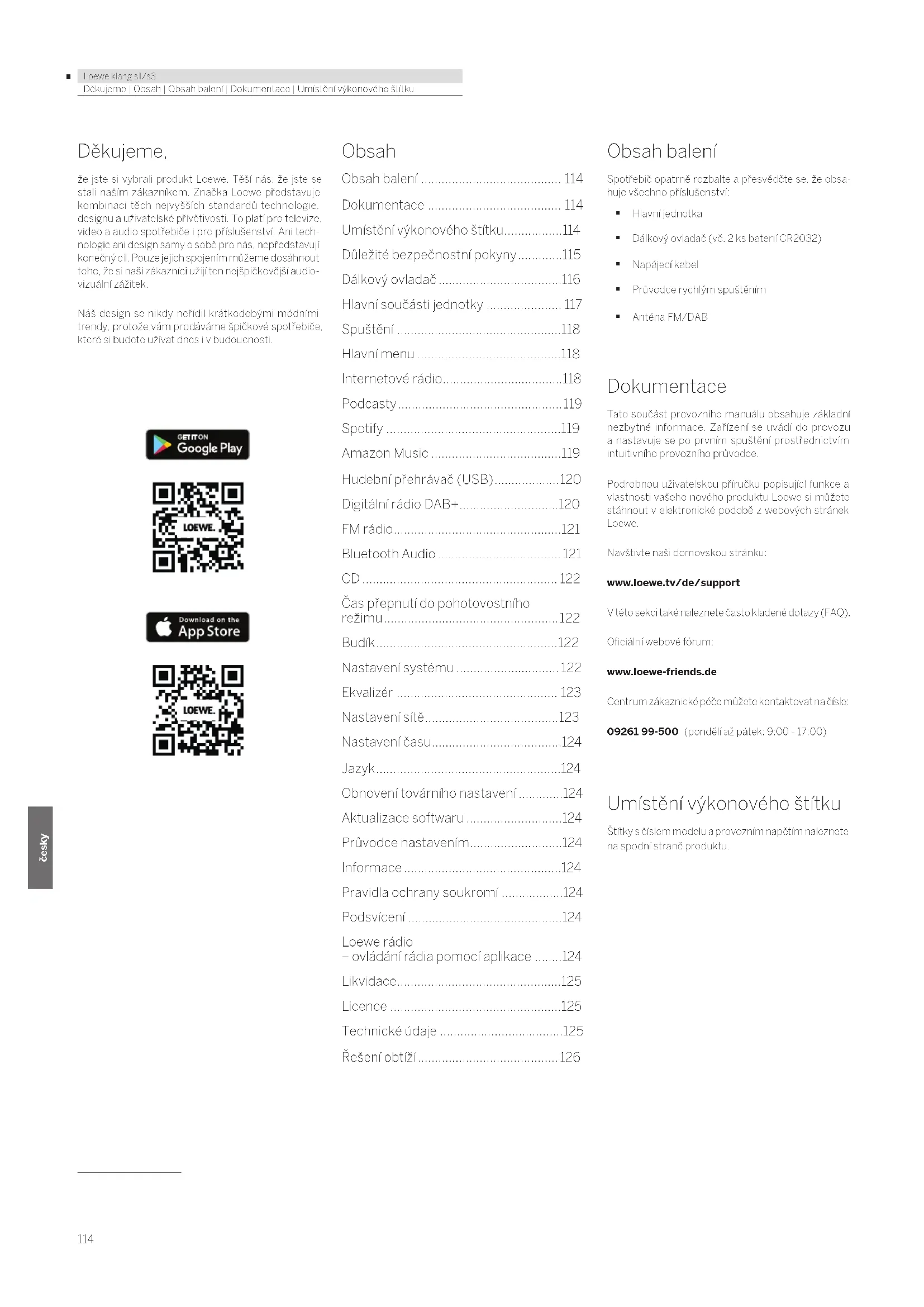 - Řešení obtíží Obsah balení Spotřebič opatrně rozbalte a přesvědčte se, že obsa- huje všechno příslušenství: Hlavní jednotka Dálkový ovladač (vč. 2 ks baterií CR2032) Napájecí kabel Průvodce rychlým spuštěním Anténa FM/DAB Dokumentace Tato součást provozního manuálu obsahuje základní nezbytné informace. Zařízení se uvádí do provozu a nastavuje se po prvním spuštění prostřednictvím intuitivního provozního průvodce. Podrobnou uživatelskou příručku popisující funkce a vlastnosti vašeho nového produktu Loewe si můžete stáhnout v elektronické podobě z webových stránek Loewe. Navštivte naši domovskou stránku: www.loewe.tv/de/support V této sekci také naleznete často kladené dotazy (FAQ). Oficiální webové fórum: www.loewe-friends.de Centrum zákaznické péče můžete kontaktovat na čísle: 09261 99-500 (pondělí až pátek: 9:00 - 17:00) Umístění výkonového štítku Štítky s číslem modelu a provozním napětím naleznete na spodní straně produktu.115 p. 126