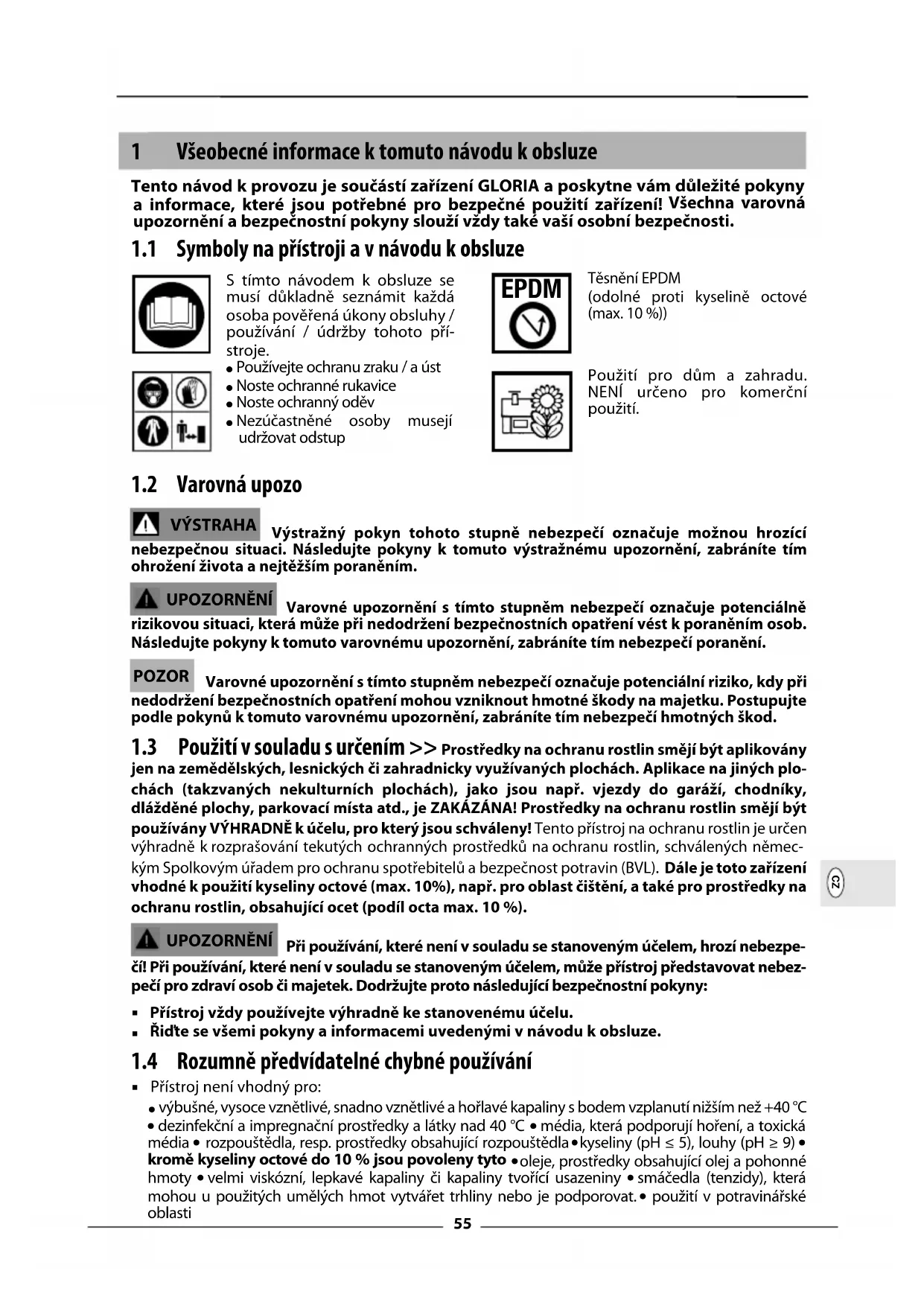 Tento návod k provozu je součástí zařízení GLORIA a poskytne vám důležité pokyny a informace, které jsou potřebné pro bezpečné použití zařízení! Všechna varovná upozornění a bezpečnostní pokyny slouží vždy také vaší osobní bezpečnosti.