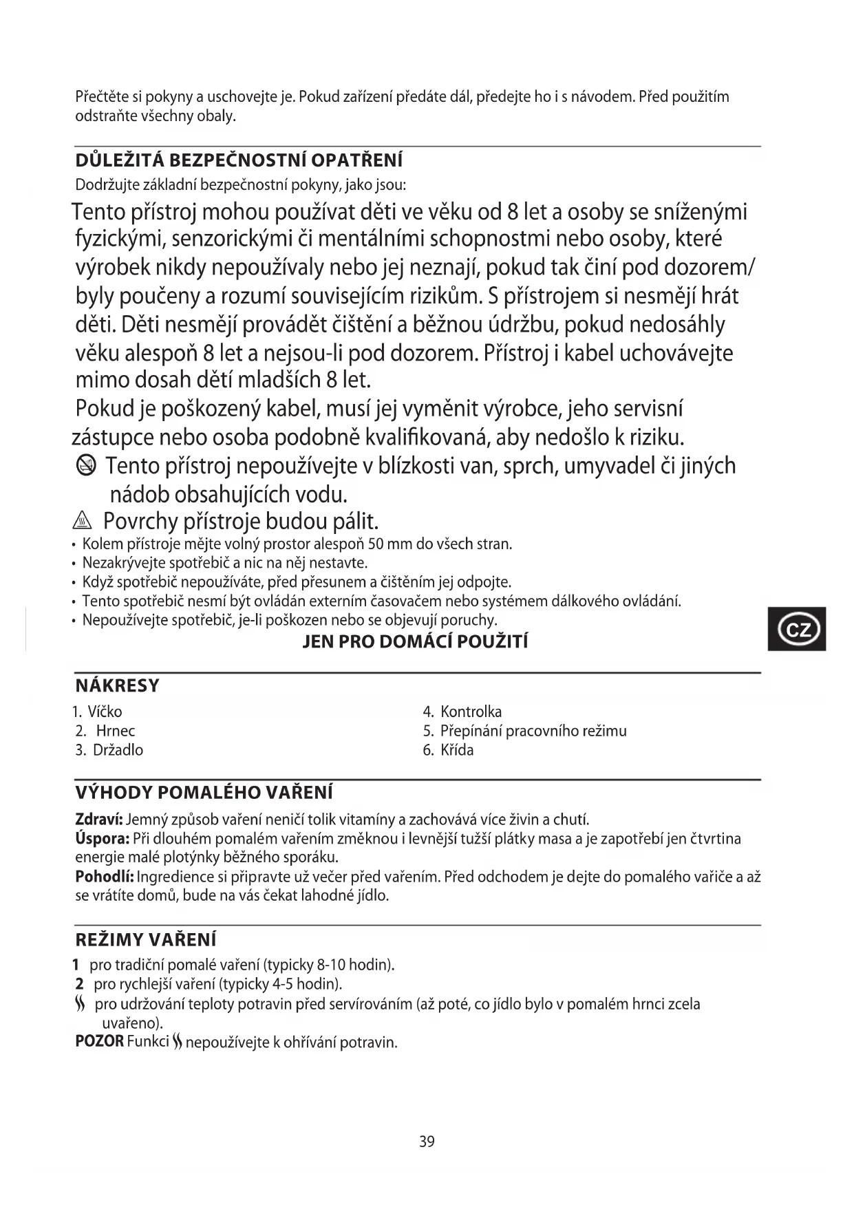Tento prístroj mohou používat déti ve věku od 8 let a osoby se snízenými fyzickými, senzorickými ā mentalnimi schopnostmi nebo osoby, které vyrobek nikdy nepoužívaly nebo jej neznají,Pokud tak āciní pod dozorem/ byly poučeny a Rozumi souvisejćím rizikům. S prístrojem si nesměji hrát déti. Děti nesměji provadět Čištěné à bežnou udřžbu,Pokud nedosáhly věku alespón 8 let a nejsou-li pod dozorem. Prístroj i kabel uchovávejte mimo dosah déti mladsích 8 let.