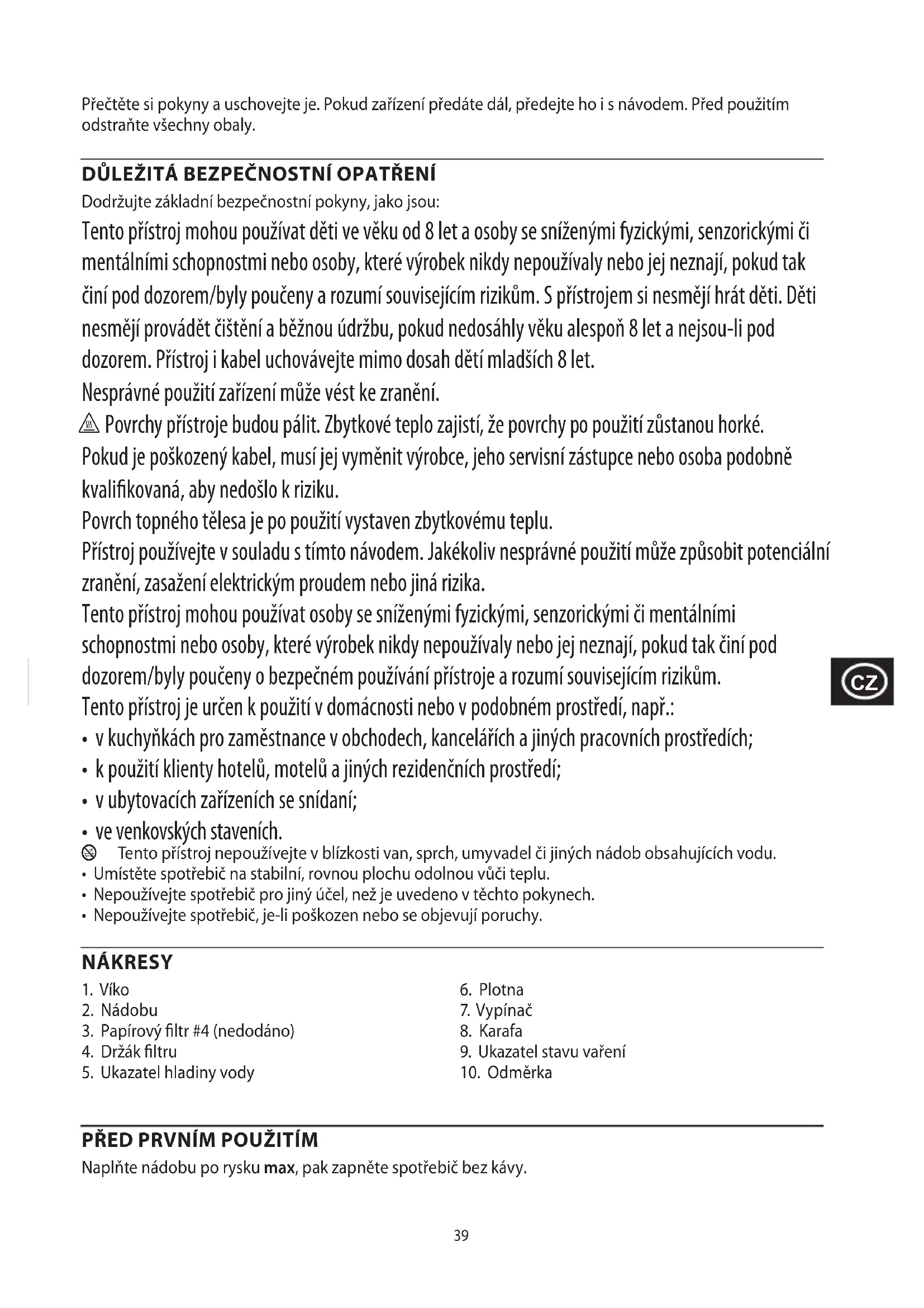 Во избежание воздействия вредных веществ на окружающую среду и здоровье приборы и батареи одноразового или многоразового использования, помеченные одним из этих символов, необходимо утилизировать отдельно от несортированных бытовых отходов. Обязательно утилизируйте электрические и электронные изделия, а также (если это применимо) батареи одноразового или многоразового использования в соответствующих официальных пунктах повторной переработки / сбора отходов.39 Přečtěte si pokyny a uschovejte je. Pokud zařízení předáte dál, předejte ho i s návodem. Před použitím odstraňte všechny obaly. DŮLEŽITÁ BEZPEČNOSTNÍ OPATŘENÍ Dodržujte základní bezpečnostní pokyny, jako jsou: Tento přístroj mohou používat děti ve věku od 8 let a osoby se sníženými fyzickými, senzorickými či mentálními schopnostmi nebo osoby, které výrobek nikdy nepoužívaly nebo jej neznají, pokud tak činí pod dozorem/byly poučeny a rozumí souvisejícím rizikům. S přístrojem si nesmějí hrát děti. Děti nesmějí provádět čištění a běžnou údržbu, pokud nedosáhly věku alespoň 8 let a nejsou-li pod dozorem. Přístroj i kabel uchovávejte mimo dosah dětí mladších 8 let. Nesprávné použití zařízení může vést ke zranění. h Povrchy přístroje budou pálit. Zbytkové teplo zajistí, že povrchy po použití zůstanou horké. Pokud je poškozený kabel, musí jej vyměnit výrobce, jeho servisní zástupce nebo osoba podobně kvalifikovaná, aby nedošlo k riziku. Povrch topného tělesa je po použití vystaven zbytkovému teplu. Přístroj používejte v souladu s tímto návodem. Jakékoliv nesprávné použití může způsobit potenciální zranění, zasažení elektrickým proudem nebo jiná rizika. Tento přístroj mohou používat osoby se sníženými fyzickými, senzorickými či mentálními schopnostmi nebo osoby, které výrobek nikdy nepoužívaly nebo jej neznají, pokud tak činí pod dozorem/byly poučeny o bezpečném používání přístroje a rozumí souvisejícím rizikům. Tento přístroj je určen k použití v domácnosti nebo v podobném prostředí, např.: