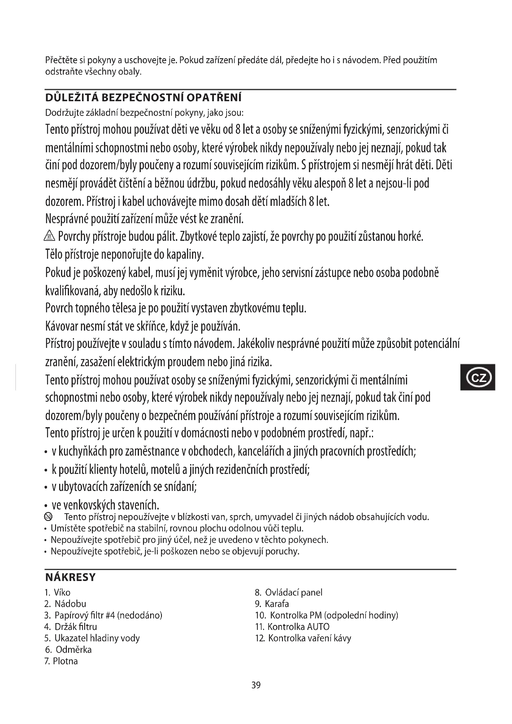Во избежание воздействия вредных веществ на окружающую среду и здоровье приборы и батареи одноразового или многоразового использования, помеченные одним из этих символов, необходимо утилизировать отдельно от несортированных бытовых отходов. Обязательно утилизируйте электрические и электронные изделия, а также (если это применимо) батареи одноразового или многоразового использования в соответствующих официальных пунктах повторной переработки/сбора отходов.39 Přečtěte si pokyny a uschovejte je. Pokud zařízení předáte dál, předejte ho i s návodem. Před použitím odstraňte všechny obaly. DŮLEŽITÁ BEZPEČNOSTNÍ OPATŘENÍ Dodržujte základní bezpečnostní pokyny, jako jsou: Tento přístroj mohou používat děti ve věku od 8 let a osoby se sníženými fyzickými, senzorickými či mentálními schopnostmi nebo osoby, které výrobek nikdy nepoužívaly nebo jej neznají, pokud tak činí pod dozorem/byly poučeny a rozumí souvisejícím rizikům. S přístrojem si nesmějí hrát děti. Děti nesmějí provádět čištění a běžnou údržbu, pokud nedosáhly věku alespoň 8 let a nejsou-li pod dozorem. Přístroj i kabel uchovávejte mimo dosah dětí mladších 8 let. Nesprávné použití zařízení může vést ke zranění. h Povrchy přístroje budou pálit. Zbytkové teplo zajistí, že povrchy po použití zůstanou horké. Tělo přístroje neponořujte do kapaliny. Pokud je poškozený kabel, musí jej vyměnit výrobce, jeho servisní zástupce nebo osoba podobně kvalikovaná, aby nedošlo k riziku. Povrch topného tělesa je po použití vystaven zbytkovému teplu. Kávovar nesmí stát ve skříňce, když je používán. Přístroj používejte v souladu s tímto návodem. Jakékoliv nesprávné použití může způsobit potenciální zranění, zasažení elektrickým proudem nebo jiná rizika. Tento přístroj mohou používat osoby se sníženými fyzickými, senzorickými či mentálními schopnostmi nebo osoby, které výrobek nikdy nepoužívaly nebo jej neznají, pokud tak činí pod dozorem/byly poučeny o bezpečném používání přístroje a rozumí souvisejícím rizikům. Tento přístroj je určen k použití v domácnosti nebo v podobném prostředí, např.: