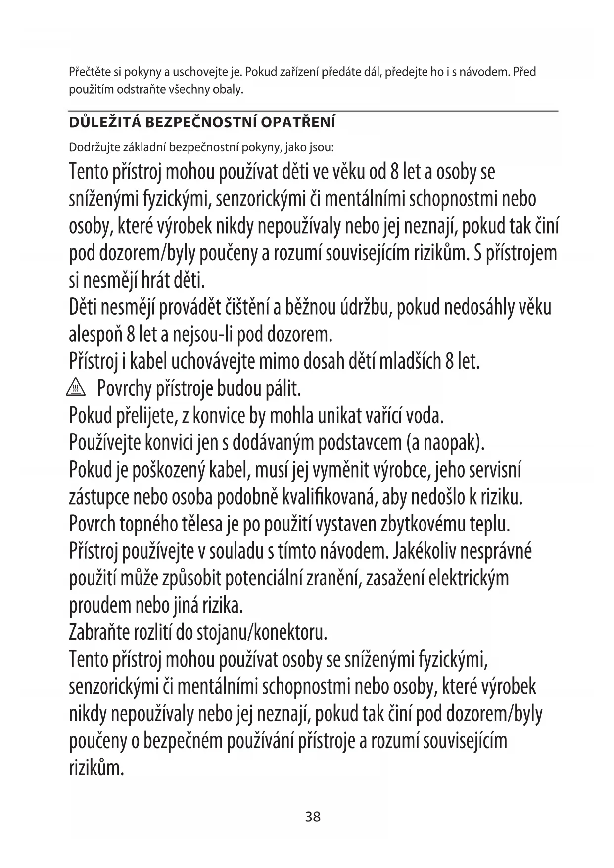AE38 Přečtěte si pokyny a uschovejte je. Pokud zařízení předáte dál, předejte ho i s návodem. Před použitím odstraňte všechny obaly. DŮLEŽITÁ BEZPEČNOSTNÍ OPATŘENÍ Dodržujte základní bezpečnostní pokyny, jako jsou: Tento přístroj mohou používat děti ve věku od 8 let a osoby se sníženými fyzickými, senzorickými či mentálními schopnostmi nebo osoby, které výrobek nikdy nepoužívaly nebo jej neznají, pokud tak činí pod dozorem/byly poučeny a rozumí souvisejícím rizikům. S přístrojem si nesmějí hrát děti. Děti nesmějí provádět čištění a běžnou údržbu, pokud nedosáhly věku alespoň 8 let a nejsou-li pod dozorem. Přístroj i kabel uchovávejte mimo dosah dětí mladších 8 let. h Povrchy přístroje budou pálit. Pokud přelijete, z konvice by mohla unikat vařící voda. Používejte konvici jen s dodávaným podstavcem (a naopak). Pokud je poškozený kabel, musí jej vyměnit výrobce, jeho servisní zástupce nebo osoba podobně kvalikovaná, aby nedošlo k riziku. Povrch topného tělesa je po použití vystaven zbytkovému teplu. Přístroj používejte v souladu s tímto návodem. Jakékoliv nesprávné použití může způsobit potenciální zranění, zasažení elektrickým proudem nebo jiná rizika. Zabraňte rozlití do stojanu/konektoru. Tento přístroj mohou používat osoby se sníženými fyzickými, senzorickými či mentálními schopnostmi nebo osoby, které výrobek nikdy nepoužívaly nebo jej neznají, pokud tak činí pod dozorem/byly poučeny o bezpečném používání přístroje a rozumí souvisejícím rizikům.39 Tento přístroj je určen k použití v domácnosti nebo v podobném prostředí, např.: