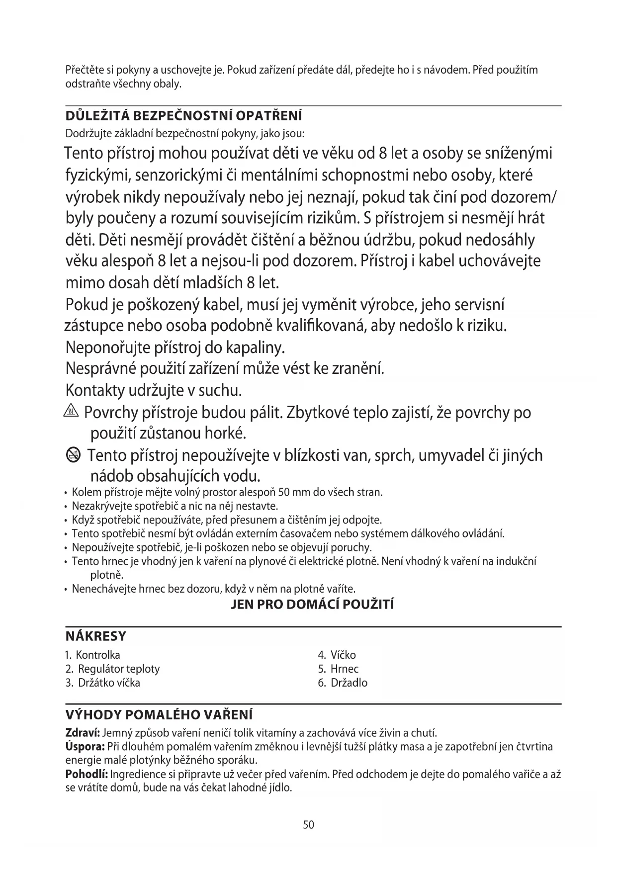 AE50 Přečtěte si pokyny a uschovejte je. Pokud zařízení předáte dál, předejte ho i s návodem. Před použitím odstraňte všechny obaly. DŮLEŽITÁ BEZPEČNOSTNÍ OPATŘENÍ Dodržujte základní bezpečnostní pokyny, jako jsou: Tento přístroj mohou používat děti ve věku od 8 let a osoby se sníženými fyzickými, senzorickými či mentálními schopnostmi nebo osoby, které výrobek nikdy nepoužívaly nebo jej neznají, pokud tak činí pod dozorem/ byly poučeny a rozumí souvisejícím rizikům. S přístrojem si nesmějí hrát děti. Děti nesmějí provádět čištění a běžnou údržbu, pokud nedosáhly věku alespoň 8 let a nejsou-li pod dozorem. Přístroj i kabel uchovávejte mimo dosah dětí mladších 8 let. Pokud je poškozený kabel, musí jej vyměnit výrobce, jeho servisní zástupce nebo osoba podobně kvalifikovaná, aby nedošlo k riziku. Neponořujte přístroj do kapaliny. Nesprávné použití zařízení může vést ke zranění. Kontakty udržujte v suchu.