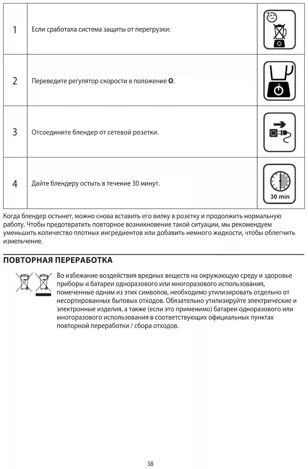 Nechte mixér vychladnout po dobu 30 minut. 30 min Po vychladnutí můžete mixér zapojit zpět do sítě a znovu jej normálně používat. Aby se to příště znovu nestalo, doporučujeme snížit množství tlustých ingrediencí, anebo přidat trochu tekutiny, aby se snáze mixovaly. RECYKLACE
