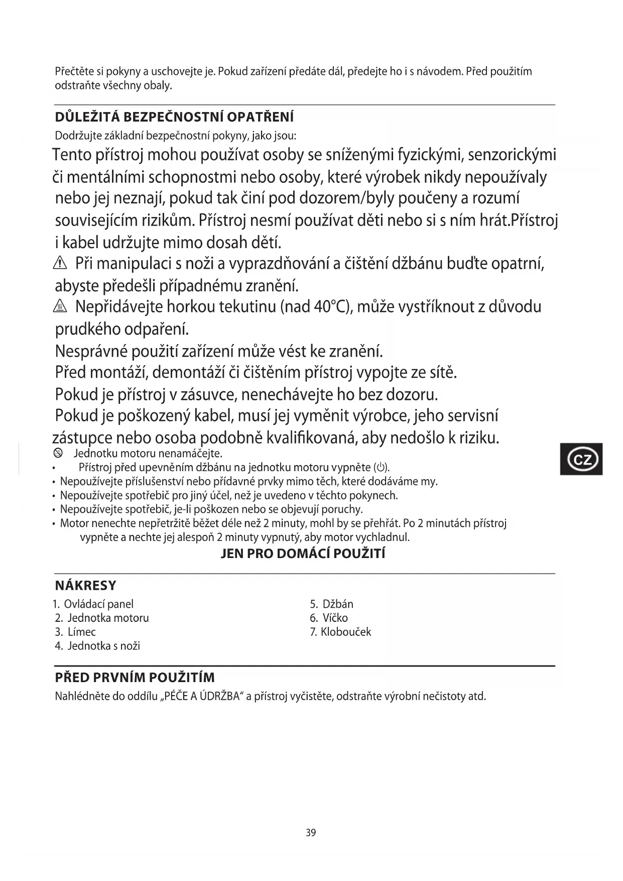 Во избежание воздействия вредных веществ на окружающую среду и здоровье приборы и батареи одноразового или многоразового использования, помеченные одним из этих символов, необходимо утилизировать отдельно от несортированных бытовых отходов. Обязательно утилизируйте электрические и электронные изделия, а также (если это применимо) батареи одноразового или многоразового использования в соответствующих официальных пунктах повторной переработки/сбора отходов.39 Přečtěte si pokyny a uschovejte je. Pokud zařízení předáte dál, předejte ho i s návodem. Před použitím odstraňte všechny obaly. DŮLEŽITÁ BEZPEČNOSTNÍ OPATŘENÍ Dodržujte základní bezpečnostní pokyny, jako jsou: Tento přístroj mohou používat osoby se sníženými fyzickými, senzorickými či mentálními schopnostmi nebo osoby, které výrobek nikdy nepoužívaly nebo jej neznají, pokud tak činí pod dozorem/byly poučeny a rozumí souvisejícím rizikům. Přístroj nesmí používat děti nebo si s ním hrát.Přístroj i kabel udržujte mimo dosah dětí. c Při manipulaci s noži a vyprazdňování a čištění džbánu buďte opatrní, abyste předešli případnému zranění. h Nepřidávejte horkou tekutinu (nad 40°C), může vystříknout z důvodu prudkého odpaření. Nesprávné použití zařízení může vést ke zranění. Před montáží, demontáží či čištěním přístroj vypojte ze sítě. Pokud je přístroj v zásuvce, nenechávejte ho bez dozoru. Pokud je poškozený kabel, musí jej vyměnit výrobce, jeho servisní zástupce nebo osoba podobně kvalikovaná, aby nedošlo k riziku. l Jednotku motoru nenamáčejte.