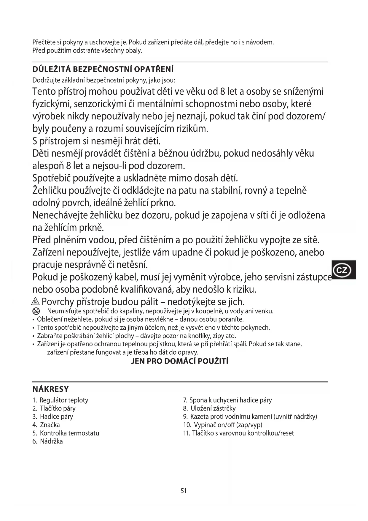 Přečtěte si pokyny a uschovejte je. Pokud zařízení předáte dál, předejte ho i s návodem. Před použitím odstraňte všechny obaly. DŮLEŽITÁ BEZPEČNOSTNÍ OPATŘENÍ Dodržujte základní bezpečnostní pokyny, jako jsou: Tento přístroj mohou používat děti ve věku od 8 let a osoby se sníženými fyzickými, senzorickými či mentálními schopnostmi nebo osoby, které výrobek nikdy nepoužívaly nebo jej neznají, pokud tak činí pod dozorem/ byly poučeny a rozumí souvisejícím rizikům. S přístrojem si nesmějí hrát děti. Děti nesmějí provádět čištění a běžnou údržbu, pokud nedosáhly věku alespoň 8 let a nejsou-li pod dozorem. Spotřebič používejte a uskladněte mimo dosah dětí. Žehličku používejte či odkládejte na patu na stabilní, rovný a tepelně odolný povrch, ideálně žehlící prkno. Nenechávejte žehličku bez dozoru, pokud je zapojena v síti či je odložena na žehlícím prkně. Před plněním vodou, před čištěním a po použití žehličku vypojte ze sítě. Zařízení nepoužívejte, jestliže vám upadne či pokud je poškozeno, anebo pracuje nesprávně či netěsní. Pokud je poškozený kabel, musí jej vyměnit výrobce, jeho servisní zástupce nebo osoba podobně kvalikovaná, aby nedošlo k riziku. h Povrchy přístroje budou pálit – nedotýkejte se jich.
