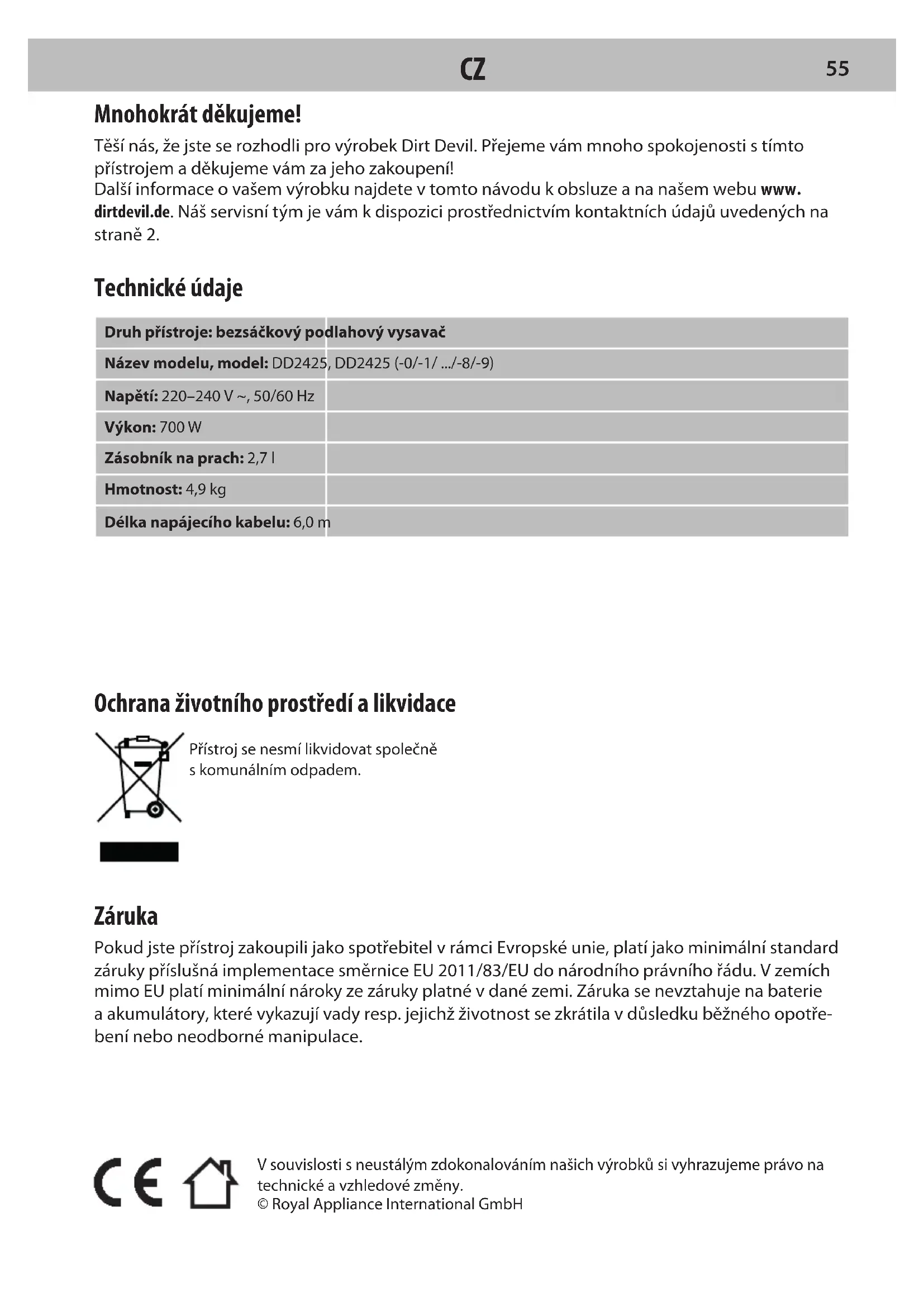 54Ochrana životního prostředí alikvidace Přístroj se nesmí likvidovat společně skomunálním odpadem. Záruka Pokud jste přístroj zakoupili jako spotřebitel vrámci Evropské unie, platí jako minimální standard záruky příslušná implementace směrnice EU 2011/83/EU do národního právního řádu. Vzemích mimo EU platí minimální nároky ze záruky platné vdané zemi. Záruka se nevztahuje na baterie aakumulátory, které vykazují vady resp. jejichž životnost se zkrátila vdůsledku běžného opotře- bení nebo neodborné manipulace. V souvislosti s neustálým zdokonalováním našich výrobků si vyhrazujeme právo na technické a vzhledové změny. © Royal Appliance International GmbH Mnohokrát děkujeme! Těší nás, že jste se rozhodli pro výrobek Dirt Devil. Přejeme vám mnoho spokojenosti stímto přístrojem aděkujeme vám za jeho zakoupení! Další informace ovašem výrobku najdete vtomto návodu kobsluze ana našem webu www. dirtdevil.de. Náš servisní tým je vám kdispozici prostřednictvím kontaktních údajů uvedených na straně 2. Technické údaje Druh přístroje: bezsáčkový podlahový vysavač Název modelu, model: DD2425, DD2425 (-0/-1/ .../-8/-9) Napětí: 220–240 V ~, 50/60 Hz Výkon: 700 W Zásobník na prach: 2,7 l Hmotnost: 4,9 kg Délka napájecího kabelu: 6,0 m