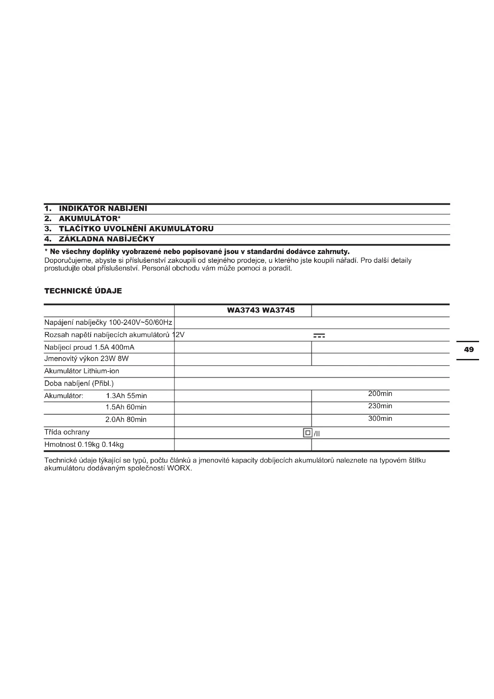 - Ne všechny doplňky vyobrazené nebo popisované jsou v standardní dodávce zahrnuty. Doporučujeme, abyste si příslušenství zakoupili od stejného prodejce, u kterého jste koupili nářadí. Pro další detaily prostudujte obal příslušenství. Personál obchodu vám může pomoci a poradit. TECHNICKÉ ÚDAJE WA3743 WA3745 Napájení nabíječky 100-240V~50/60Hz Rozsah napětí nabíjecích akumulátorů 12V Nabíjecí proud 1.5A 400mA Jmenovitý výkon 23W 8W Akumulátor Lithium-ion Doba nabíjení (Přibl.) Akumulátor: 1.3Ah 55min 200min 1.5Ah 60min 230min 2.0Ah 80min 300min Třída ochrany /II Hmotnost 0.19kg 0.14kg Technické údaje týkající se typů, počtu článků a jmenovité kapacity dobíjecích akumulátorů naleznete na typovém štítku akumulátoru dodávaným společností WORX.50