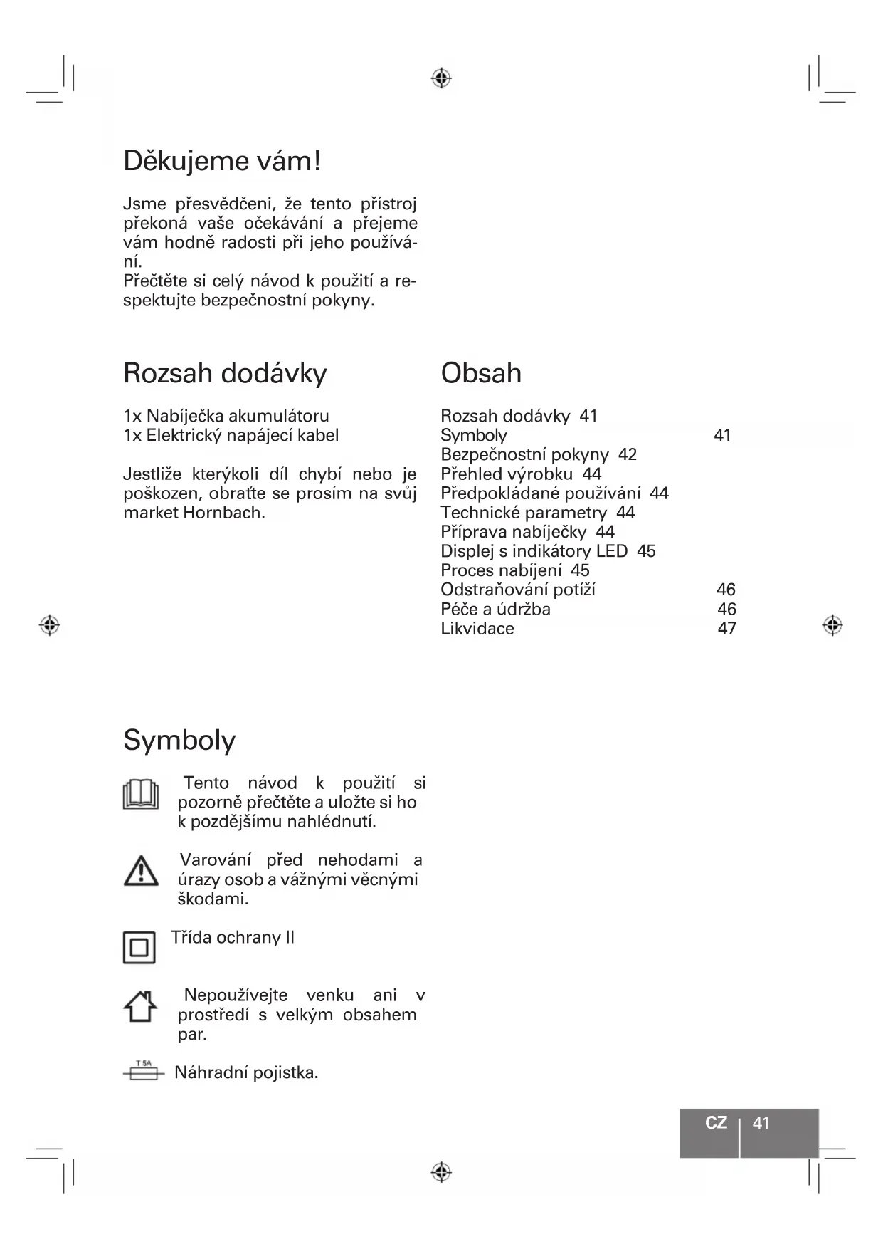 Děkujeme vám! Jsme přesvědčeni, že tento přístroj překoná vaše očekávání a přejeme vám hodně radosti při jeho používá- ní. Přečtěte si celý návod k použití a re- spektujte bezpečnostní pokyny. Rozsah dodávky 1x Nabíječka akumulátoru 1x Elektrický napájecí kabel Jestliže kterýkoli díl chybí nebo je poškozen, obraťte se prosím na svůj market Hornbach. Symboly Tento návod k použití si pozorně přečtěte a uložte si ho k pozdějšímu nahlédnutí. Varování před nehodami a úrazy osob a vážnými věcnými škodami. Třída ochrany II Nepoužívejte venku ani v prostředí s velkým obsahem par. Náhradní pojistka. Obsah Rozsah dodávky 41 Symboly 41 Bezpečnostní pokyny 42 Přehled výrobku 44 Předpokládané používání 44 Technické parametry 44 Příprava nabíječky 44 Displej s indikátory LED 45 Proces nabíjení 45 Odstraňování potíží 46 Péče a údržba 46 Likvidace 47CZ