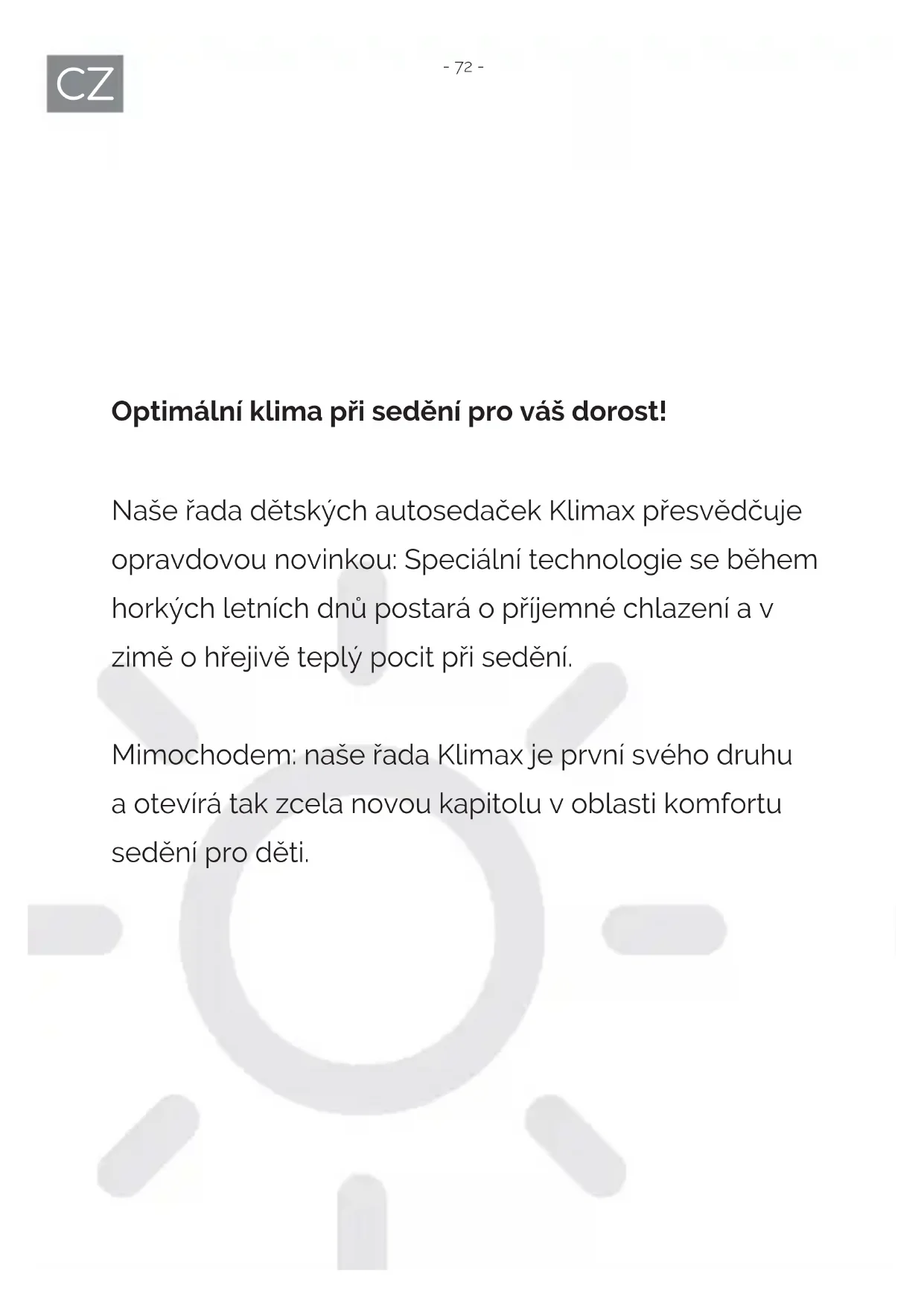 - Dité v dětské autosedacce s technologii Klimax nikdy nenechávejte bez dozoru. Nenechávejtesvédite nikdy samo pri vysových venkovnich teplotách v leté, resp. nizkích venkovnich teplotách v zime ve vozidle. Technologie Klimax nezajistuje ochranu préd smrti nasledkem prehrátinebo podchlazen'.