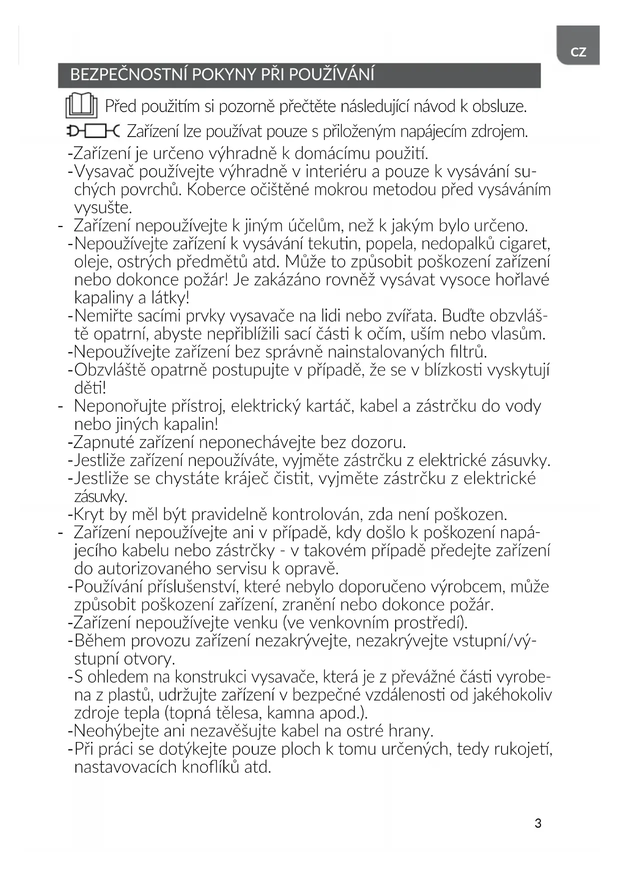 Vysavač používejte výhradně v interiéru a pouze k vysávání su- chých povrchů. Koberce očištěné mokrou metodou před vysáváním vysušte. - Zařízení nepoužívejte k jiným účelům, než k jakým bylo určeno.