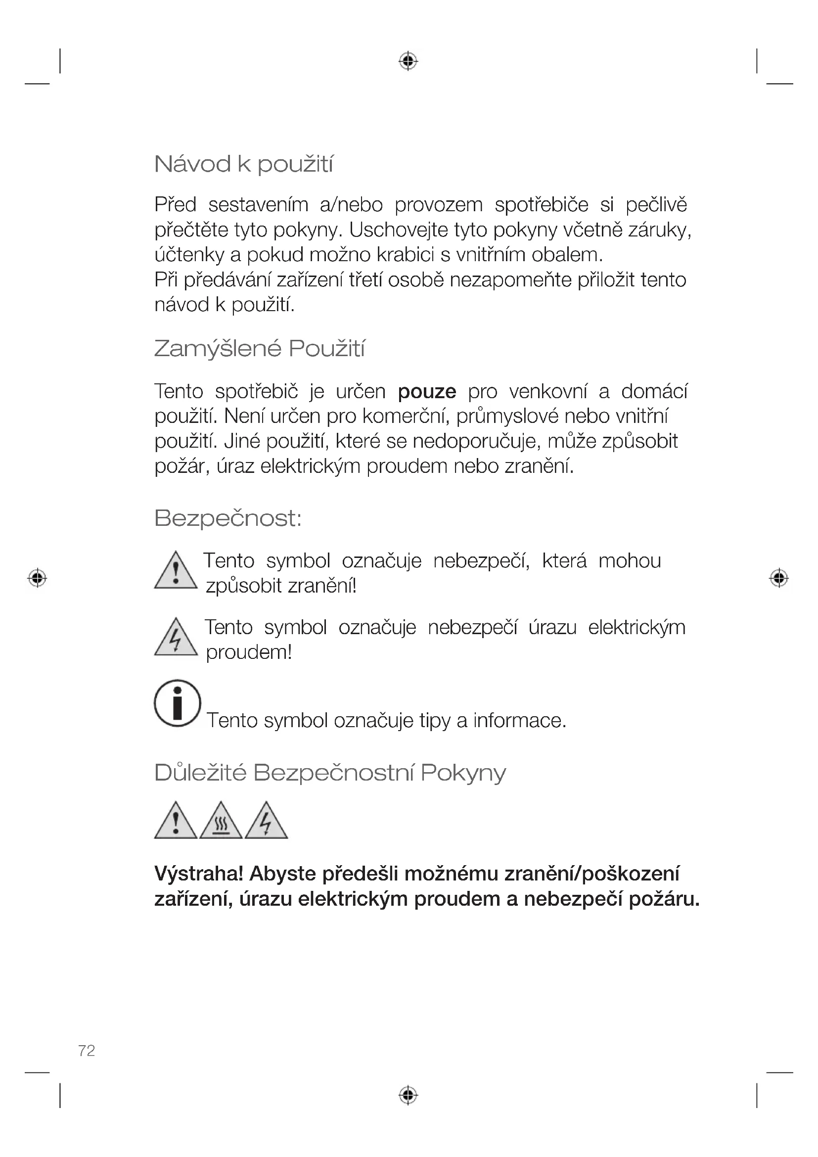 - Spotřebič používejte pouze k určenému účelu, pouze pro venkovní použití a jak je popsáno v této příručce.
