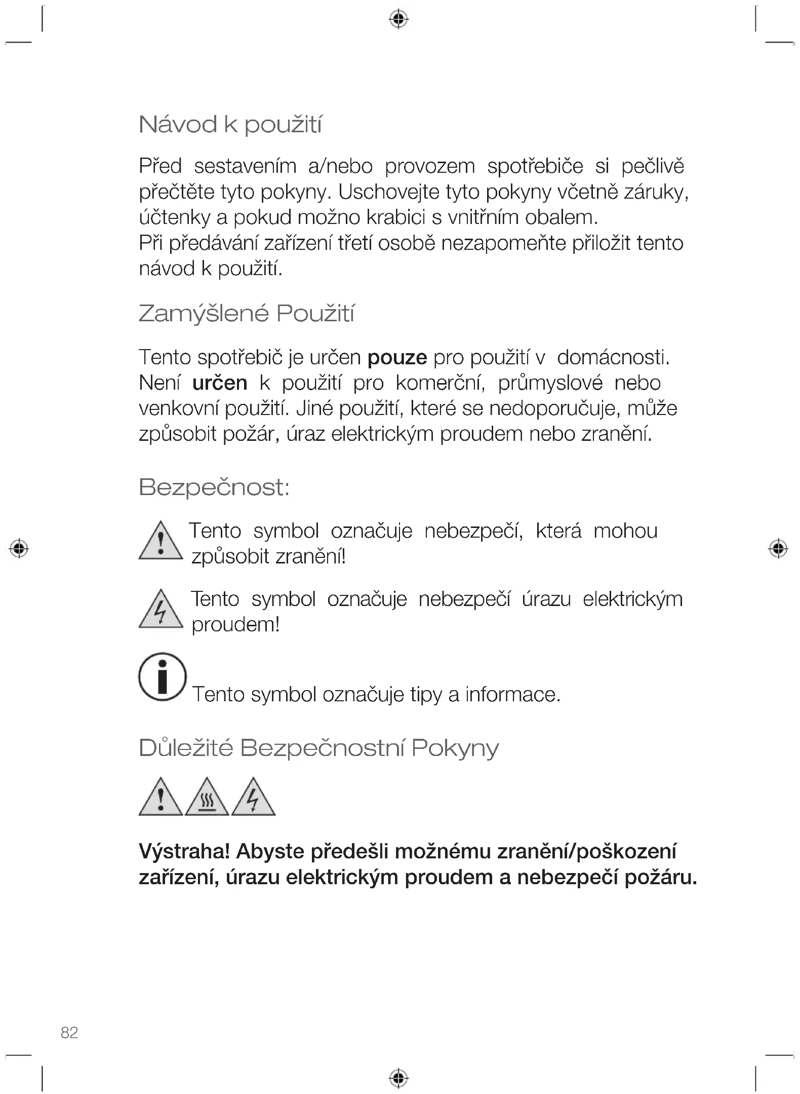 - Spotřebič používejte pouze k jeho zamýšlenému účelu a jak je popsáno v této příručce, pouze v interiéru.