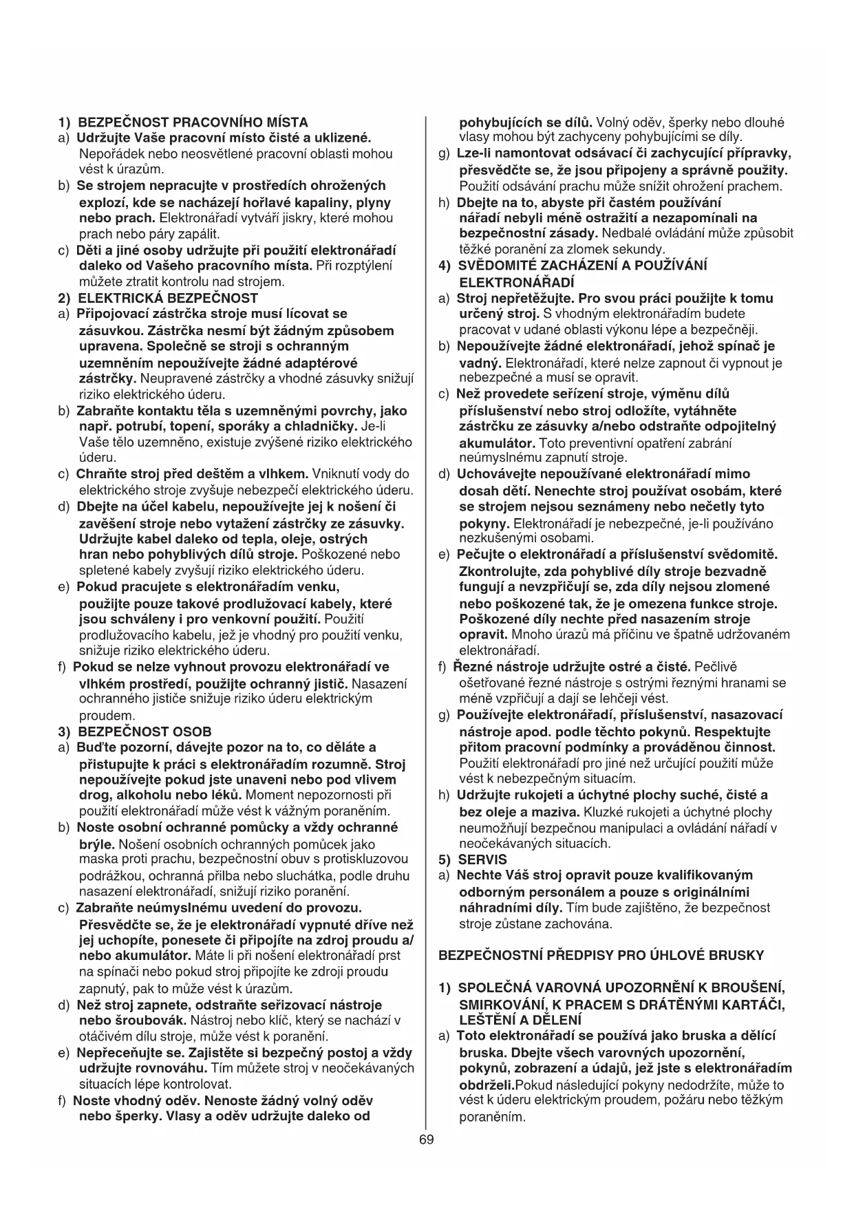 a) Toto elektronářadí se používá jako bruska a dělící bruska. Dbejte všech varovných upozornění, pokynů, zobrazení a údajů, jež jste s elektronářadím obdrželi.Pokud následující pokyny nedodržíte, může to vést k úderu elektrickým proudem, požáru nebo těžkým poraněním.