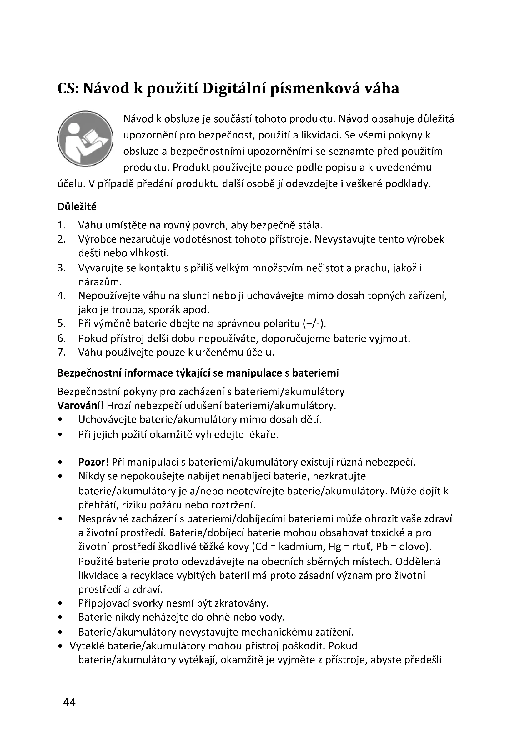 - Nesprávné zacházení s bateriemi/dobíjecími bateriemi může ohrozit vaše zdraví a životní prostředí. Baterie/dobíjecí baterie mohou obsahovat toxické a pro životní prostředí škodlivé těžké kovy (Cd = kadmium, Hg = rtuť, Pb = olovo). Použité baterie proto odevzdávejte na obecních sběrných místech. Oddělená likvidace a recyklace vybitých baterií má proto zásadní význam pro životní prostředí a zdraví.