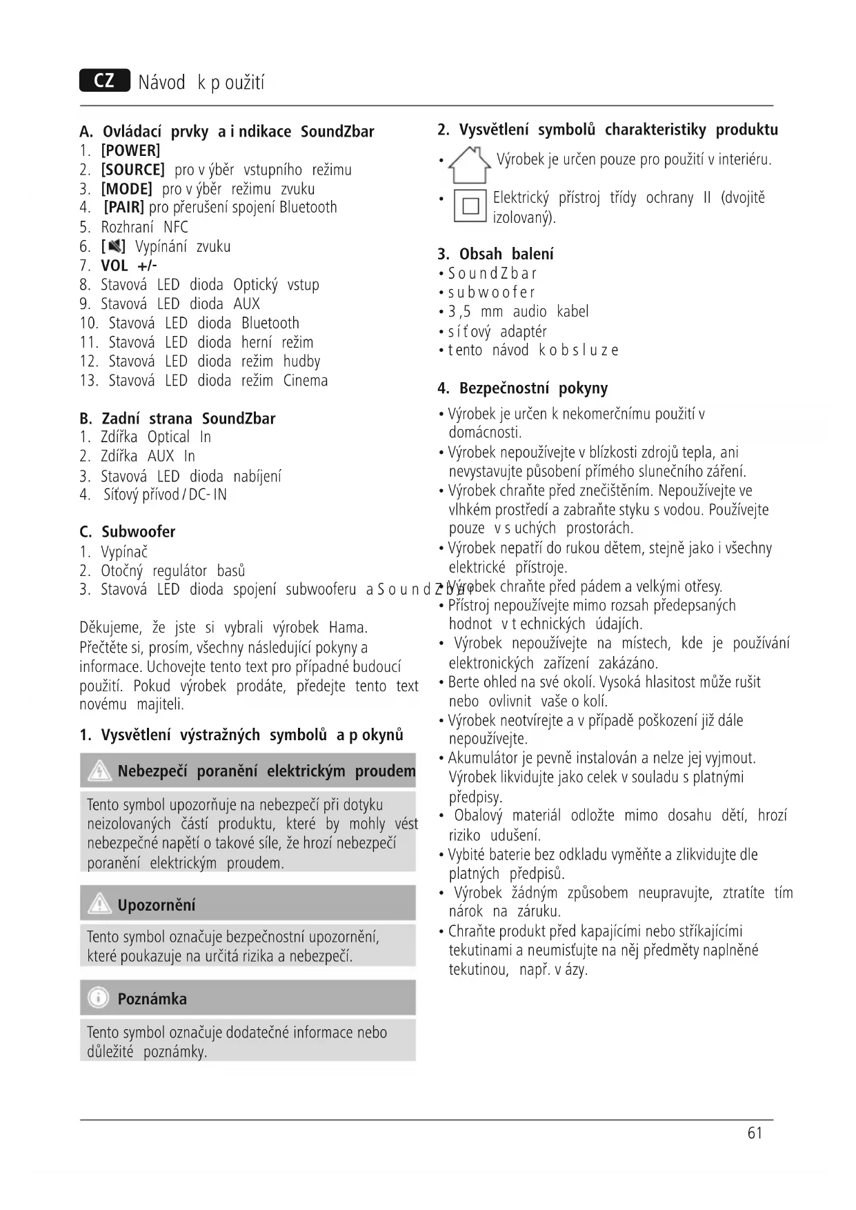 - Zařízení SoundZbar je vybaveno nabíjecí baterií. Před prvním použitím baterii zcela nabijte.