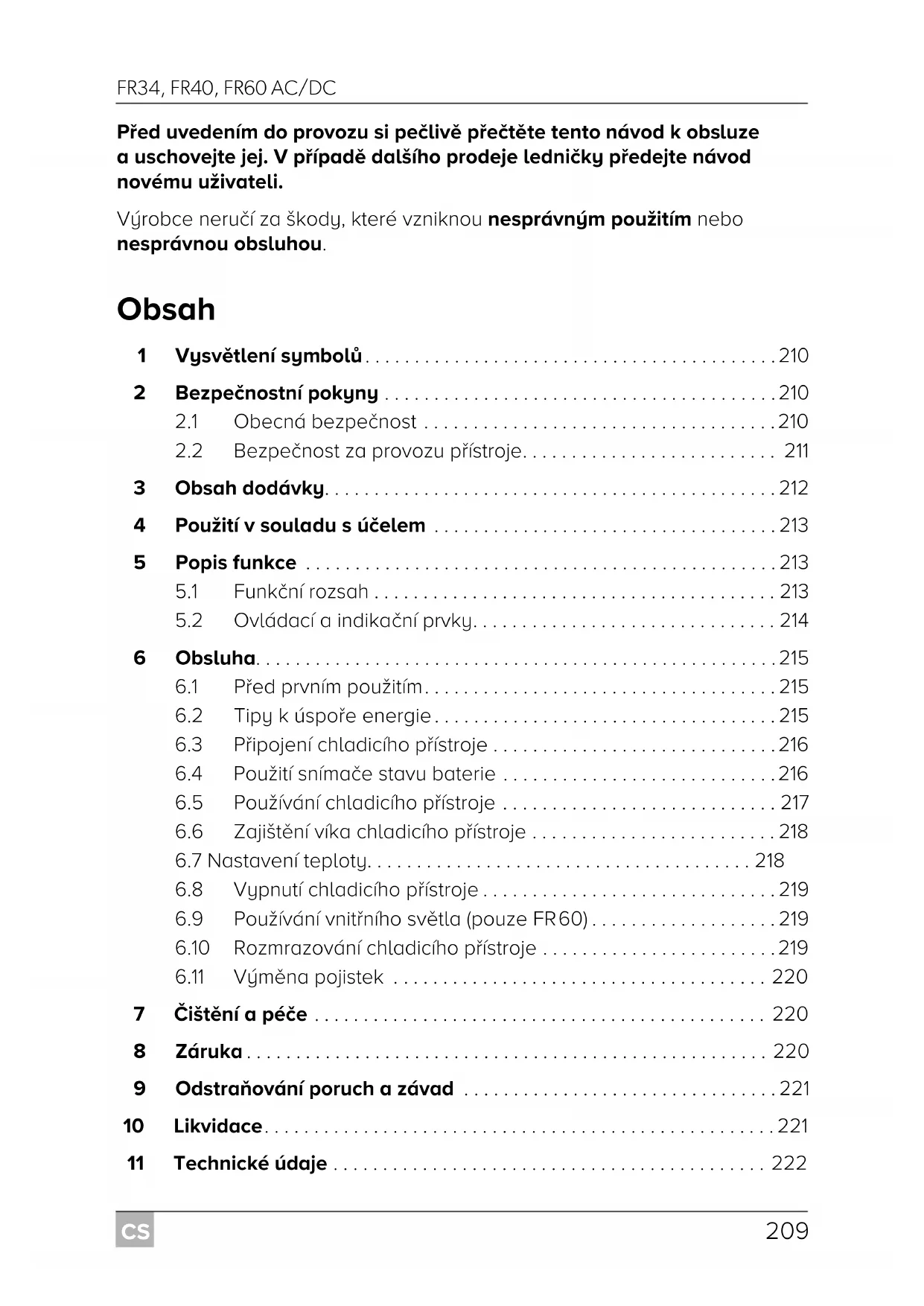 UPOZORNĚNÍ! Před uvedením do provozu zkontrolujte, zda jsou přívodní kabel azástrčka suché. FR34-FR40-FR60--O-16s.book Seite 211 Donnerstag, 19. Juli 2018 3:22 15CS Obsah dodávky FR34, FR40, FR60 AC/DC