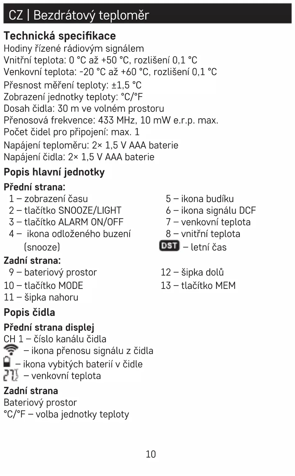 Volba jednotky teploty °C/°F Opakovaným stiskem tlačítek / nastavíte zobrazení jednotky teploty °C nebo °F. Režim zobrazení displeje Opakovaným stiskem tlačítka MODE zobrazíte postupně: aktuální čas – čas budíku – datum. Nastavení budíku Dlouhým stiskem tlačítka ALARM ON/OFF a tlačítky / nastavte čas buzení. Mezi hodnotami se přesunete stiskem tlačítka ALARM ON/OFF.14 Po nastavení hodin a minut stiskněte tlačítko ALARM ON/OFF. Ikona zvonku značí, že budík je aktivní. Pro deaktivaci budíku znovu stiskněte tlačítko ALARM ON/OFF, ikona zvonku zmizí. Funkce opakovaného buzení (snooze) a podsvícení displeje Zvonění budíku posunete o 5 minut stiskem tlačítka SNOOZE/LIGHT při zvonění. Na displeji se objeví ikona „Zz“. Pro zrušení funkce snooze, stiskněte jakékoliv tlačítko kromě SNOOZE/LIGHT. Pokud nechcete využít funkci snooze, stiskněte při zvonění jakékoliv tlačítko kromě SNOOZE/LIGHT, budík zazní další den. Pokud nestisknete během zvonění žádné tlačítko, bude alarm aktivní po dobu 2 minut a zazní další den. Ve standardním režimu stiskem tlačítka SNOOZE/LIGHT aktivujete podsvícení displeje na 10 sekund. Paměť naměřených hodnot Opakovaným stiskem tlačítka MEM zobrazíte maximální a minimální naměřené hodnoty venkovní a vnitřní teploty. Pro vymazání paměti dlouze stiskněte tlačítko MEM v režimu zobrazení maximálních/minimálních hodnot. Péče a údržba Výrobek je navržen tak, aby při vhodném zacházení spolehlivě sloužil řadu let. Zde je několik rad pro správnou obsluhu: