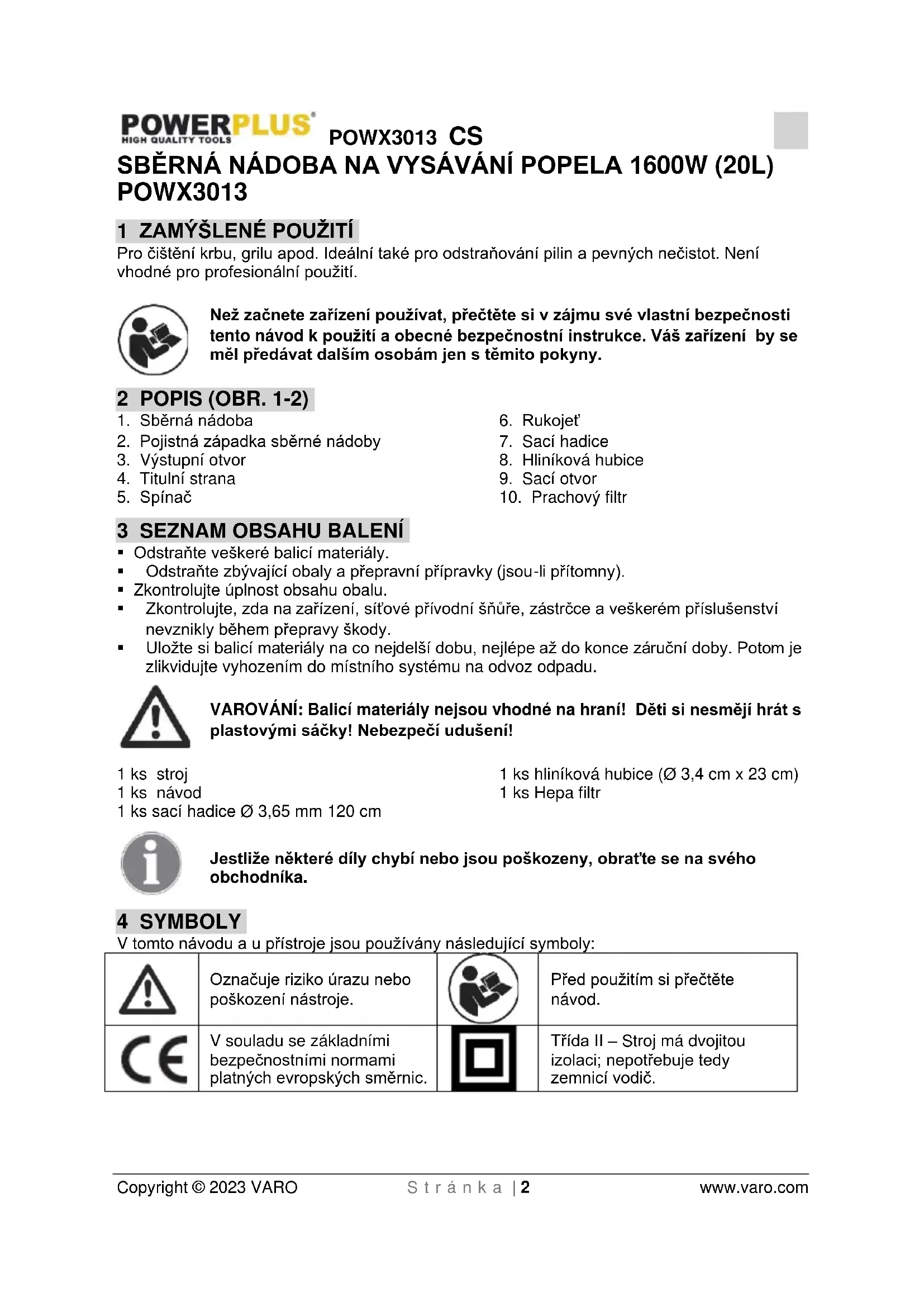 - Opět vysavač na popel sestavte Upozornění: K čištění plastových dílů zařízení nepoužívejte čisticí prostředky. Doporučuje se jemný čisticí prostředek na vlhkém hadříku. Zařízení nesmí přijít do styku s vodou.POWX3013 CS Copyright © 2023 VARO S t r á n k a | 6 www.varo.com
