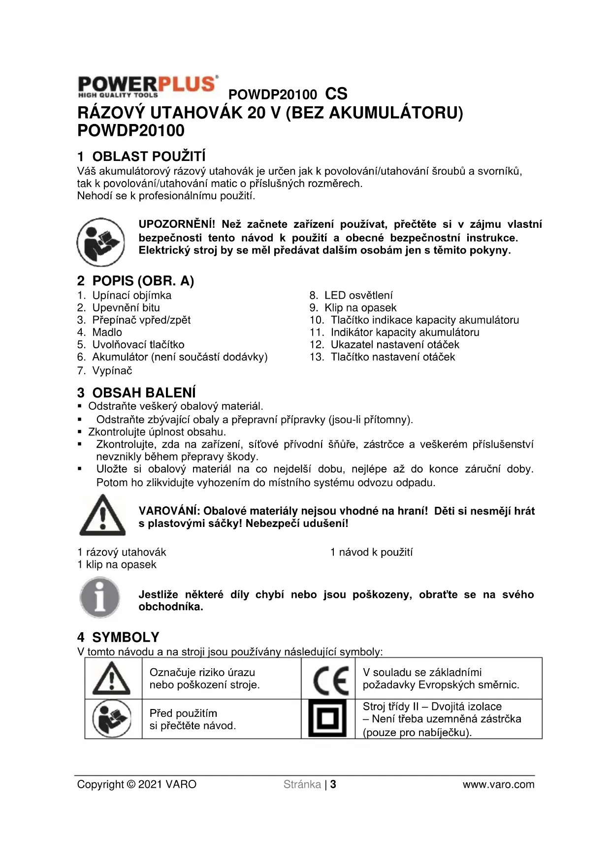 VARO – Vic. Van Rompuy N.V. - Joseph Van Instraat 9 - BE2500 Lier - BELGIUM, prohlašuje, že Výrobek: Rázový utahovák 20 V s napájením z akumulátoru Značka: PowerPlus Model: POWDP20100 je ve shodě se základními požadavky a ostatními relevantními ustanoveními příslušných evropských směrnic založených na aplikaci evropských harmonizovaných norem. Jakákoliv neschválená úprava přístroje vede ke ztrátě platnosti tohoto prohlášení. Evropské směrnice (včetně, nastanou-li, jejich změn a doplňků až do data podpisu): 2011/65/EU 2006/42/ES 2014/30/EU Evropské harmonizované normy (včetně, nastanou-li, jejich změn a doplňků až do data podpisu): EN62841-1 : 2015 EN62841-2-2 : 2014 EN55014-1 : 2017 EN55014-2 : 2015 Držitel technické dokumentace: Philippe Vankerkhove, VARO - Vic. Van Rompuy N.V. Níže podepsaný jedná jménem vedení společnosti: Ludo Mertens Regulativní postupy – Manažer pro dohled nad řádným jednáním 24/03/2021, Lier - BelgiumPOWDP20100 SK Copyright © 2021 VARO S t r a n a | 1 www.varo.com 1 POUŽÍVANIE ................................................................................... 3