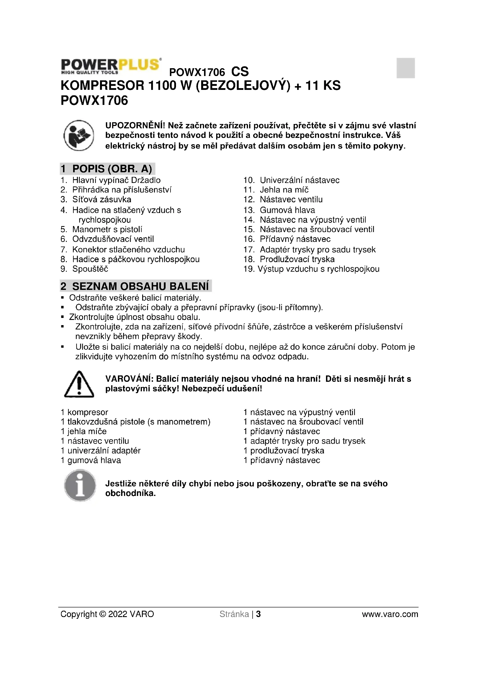 Stupeň krytí IP20 8 HLUČNOST Hodnoty hlukových emisí se měří podle příslušné normy. (K=3) Úroveň akustického tlaku LpA 84 dB(A) Úroveň akustického výkonu LwA 96 dB(A) POZOR! Hladina akustického tlaku může přesáhnout 85 dB(A), v takovém případě noste individuální chránič sluchu.POWX1706 CS Copyright © 2022 VARO Stránka | 11 www.varo.com