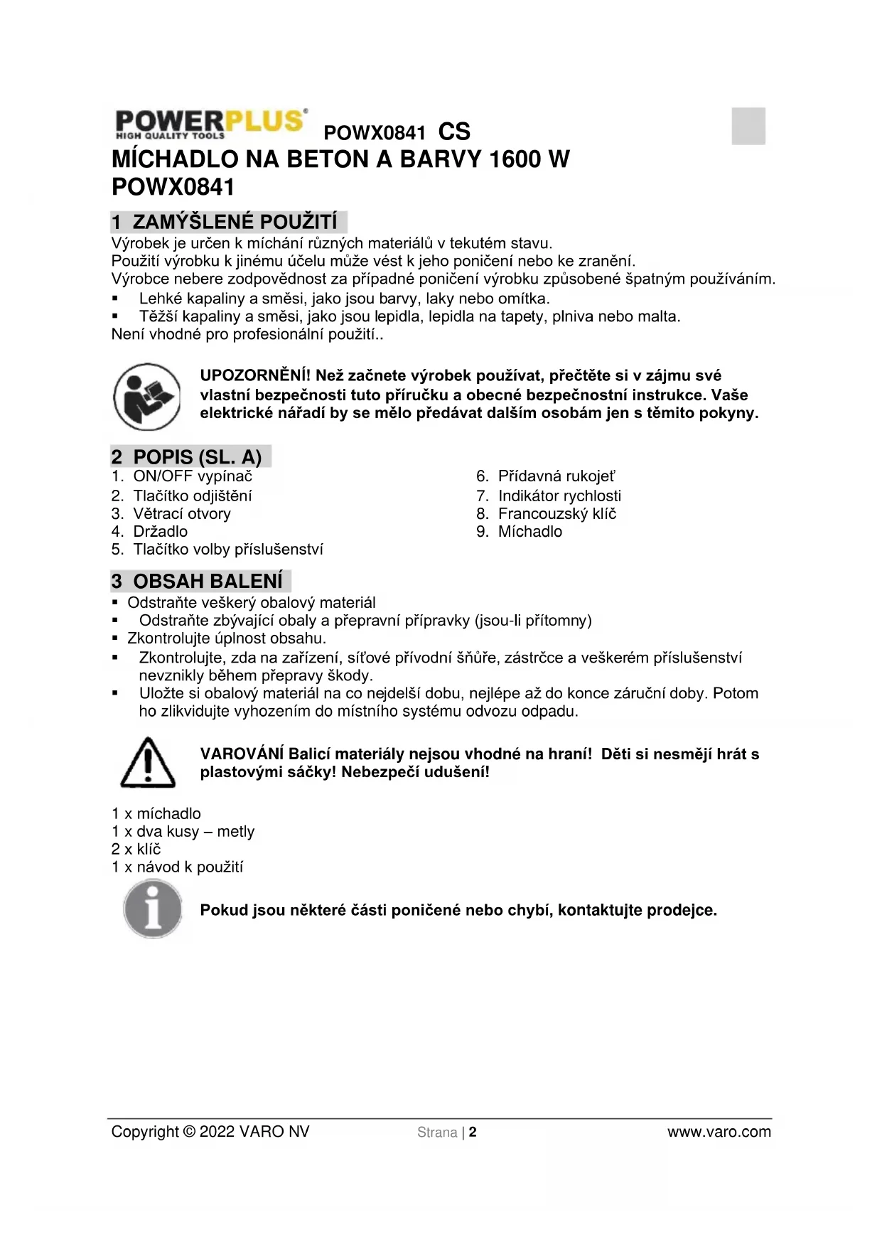 - Při práci používejte vhodné ochranné pomůcky.POWX0841 CS Copyright © 2022 VARO NV Strana | 5 www.varo.com