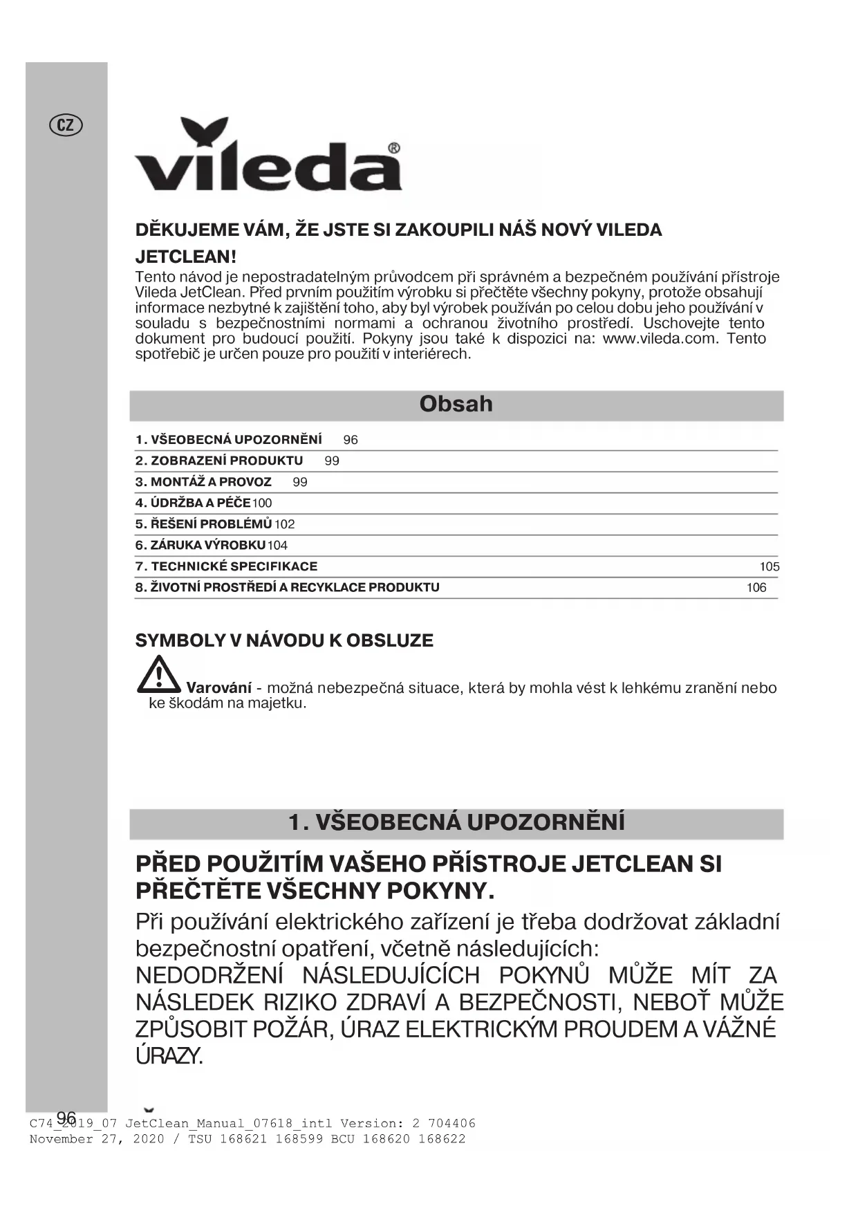 PŘED POUŽITÍM VAŠEHO PŘÍSTROJE JETCLEAN SI PŘEČTĚTE VŠECHNY POKYNY. Při používání elektrického zařízení je třeba dodržovat základní bezpečnostní opatření, včetně následujících: NEDODRŽENÍ NÁSLEDUJÍCÍCH POKYNŮ MŮŽE MÍT ZA NÁSLEDEK RIZIKO ZDRAVÍ A BEZPEČNOSTI, NEBOŤ MŮŽE ZPŮSOBIT POŽÁR, ÚRAZ ELEKTRICKÝM PROUDEM A VÁŽNÉ ÚRAZY. DĚKUJEME VÁM, ŽE JSTE SI ZAKOUPILI NÁŠ NOVÝ VILEDA JETCLEAN! Tento návod je nepostradatelným průvodcem při správném a bezpečném používání přístroje Vileda JetClean. Před prvním použitím výrobku si přečtěte všechny pokyny, protože obsahují informace nezbytné k zajištění toho, aby byl výrobek používán po celou dobu jeho používání v souladu s bezpečnostními normami a ochranou životního prostředí. Uschovejte tento dokument pro budoucí použití. Pokyny jsou také k dispozici na: www.vileda.com. Tento spotřebič je určen pouze pro použití v interiérech. Obsah 1. VŠEOBECNÁ UPOZORNĚNÍ 962. ZOBRAZENÍ PRODUKTU 993. MONTÁŽ A PROVOZ 994. ÚDRŽBA A PÉČE 1005. ŘEŠENÍ PROBLÉMŮ 10 26. ZÁRUKA VÝROBKU 10 47. TECHNICKÉ SPECIFIKACE 10 58. ŽIVOTNÍ PROSTŘEDÍ A RECYKLACE PRODUKTU 106C74_2019_07 JetClean_Manual_07618_intl Version: 2 704406November 27, 2020 / TSU 168621 168599 BCU 168620 16862297