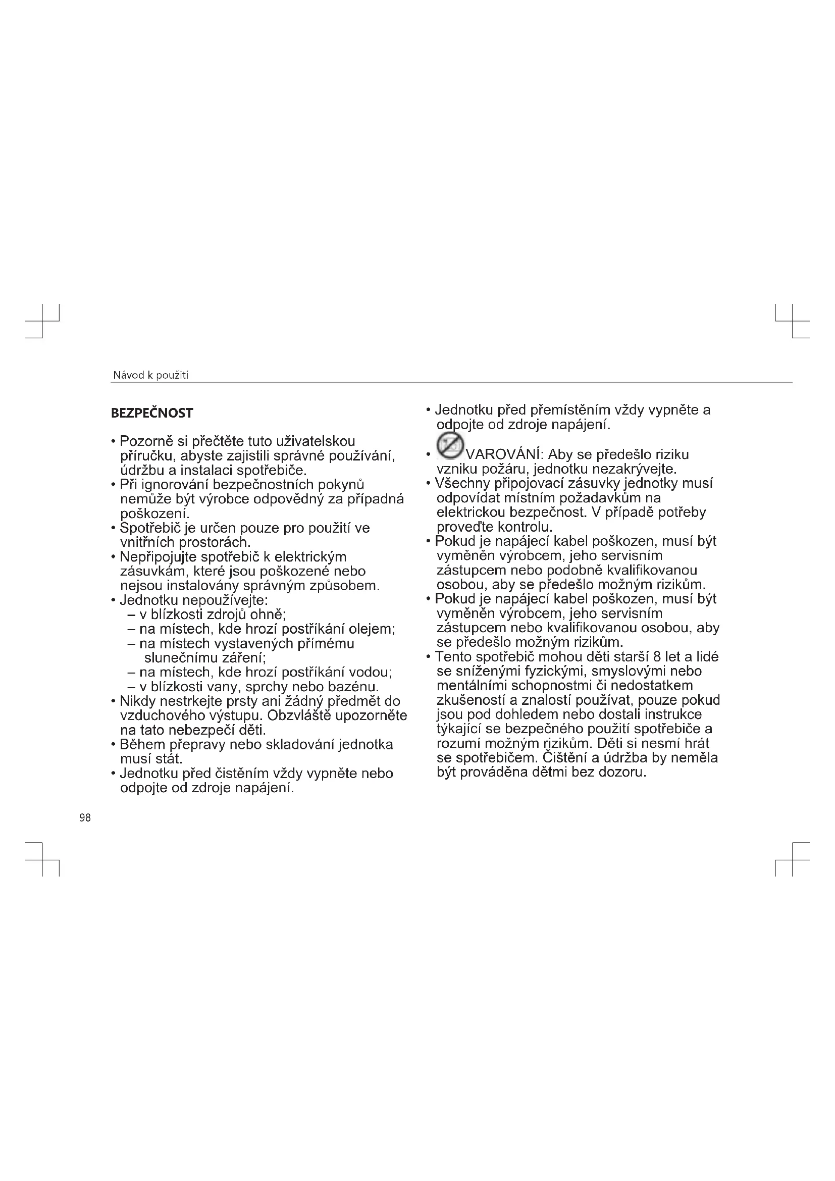 - Tento spotřebič mohou děti starší 8 let a lidé se sníženými fyzickými, smyslovými nebo mentálními schopnostmi či nedostatkem zkušeností a znalostí používat, pouze pokud jsou pod dohledem nebo dostali instrukce týkající se bezpečného použití spotřebiče a rozumí možným rizikům. Děti si nesmí hrát se spotřebičem. Čištění a údržba by neměla být prováděna dětmi bez dozoru.Návod k použití
