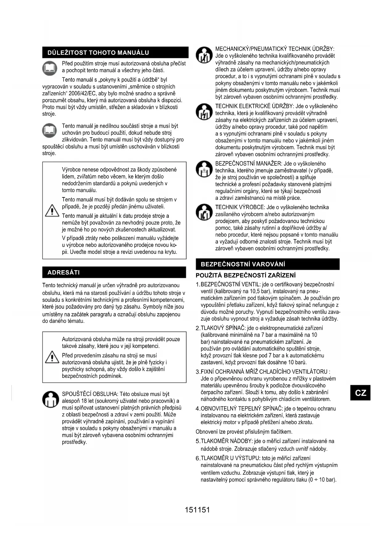 Tento technický manuál je určen výhradně pro autorizovanou obsluhu, která má na starosti používání a údržbu tohoto stroje v souladu s konkrétními technickými a profesními kompetencemi, které jsou požadovány pro daný typ zásahu. Symboly níže jsou umístěny na začátek paragrafu a označují obsluhu zapojenou do daného tématu. SPOUŠTĚCÍ OBSLUHA: Této obsluze musí být alespoň 18 let (soukromý uživatel nebo pracovník) a musí splňovat ustanovení platných právních předpisů z oblasti bezpečnosti a zdraví v zemi použití. Může provádět výhradně zapínání, používání a vypínání stroje v souladu s pokyny obsaženými v manuálu a musí být zároveň vybavena osobními ochrannými prostředky. MECHANICKÝ/PNEUMATICKÝ TECHNIK ÚDRŽBY: Jde o vyškoleného technika kvalikovaného provádět výhradně zásahy na mechanických/pneumatických dílech za účelem upravení, údržby a/nebo opravy procedur, a to i s vypnutými ochranami plně v souladu s pokyny obsaženými v tomto manuálu nebo v jakémkoli jiném dokumentu poskytnutým výrobcem. Technik musí být zároveň vybaven osobními ochrannými prostředky. TECHNIK ELEKTRICKÉ ÚDRŽBY: Jde o vyškoleného technika, která je kvalikovaný provádět výhradně zásahy na elektrických zařízeních za účelem upravení, údržby a/nebo opravy procedur, také pod napětím a s vypnutými ochranami plně v souladu s pokyny obsaženými v tomto manuálu nebo v jakémkoli jiném dokumentu poskytnutým výrobcem. Technik musí být zároveň vybaven osobními ochrannými prostředky. BEZPEČNOSTNÍ MANAŽER: Jde o vyškoleného technika, kterého jmenuje zaměstnavatel (v případě, že je stroj používán ve společnosti) a splňuje technické a profesní požadavky stanovené platnými regulačními orgány, které se týkají bezpečnosti a zdraví zaměstnanců na místě práce. TECHNIK VÝROBCE: Jde o vyškoleného technika zasílaného výrobcem a/nebo autorizovaným prodejcem, aby poskytl požadovanou technickou pomoc, také zásahy rutinní a doplňkové údržby a/ nebo procedur, které nejsou popsané v tomto manuálu a vyžadují odborné znalosti stroje. Technik musí být zároveň vybaven osobními ochrannými prostředky. Tento manuál je nedílnou součástí stroje a musí být uchován pro budoucí použití, dokud nebude stroj zlikvidován. Tento manuál musí být vždy dostupný pro spouštěcí obsluhu a musí být umístěn uschováván v blízkosti stroje. Před použitím stroje musí autorizovaná obsluha přečíst a pochopit tento manuál a všechny jeho části. Tento manuál s „pokyny k použití a údržbě“ byl vypracován v souladu s ustanoveními „směrnice o strojních zařízeních“ 2006/42/EC, aby bylo možné snadno a správně porozumět obsahu, který má autorizovaná obsluha k dispozici. Proto musí být vždy umístěn, střežen a skladován v blízkosti stroje.
