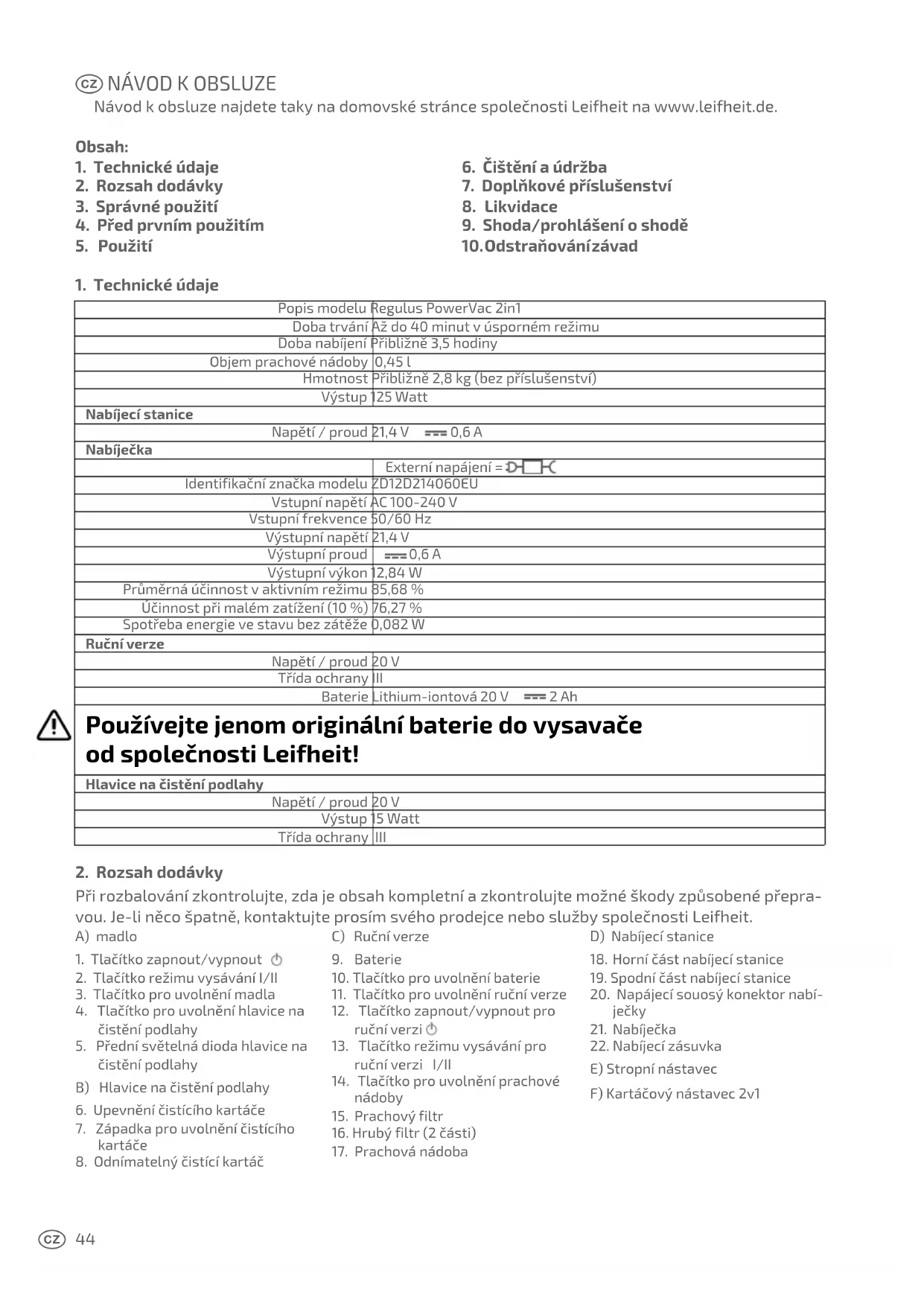 Při rozbalování zkontrolujte, zda je obsah kompletní a zkontrolujte možné škody způsobené přepra- vou. Je-li něco špatně, kontaktujte prosím svého prodejce nebo služby společnosti Leifheit. A) madlo 1. Tlačítko zapnout/vypnout 2. Tlačítko režimu vysávání I/II3. Tlačítko pro uvolnění madla4. Tlačítko pro uvolnění hlavice na čistění podlahy5. Přední světelná dioda hlavice na čistění podlahyB) Hlavice na čistění podlahy6. Upevnění čistícího kartáče7. Západka pro uvolnění čistícího kartáče8. Odnímatelný čistící kartáčC) Ruční verze9. Baterie10. Tlačítko pro uvolnění baterie11. Tlačítko pro uvolnění ruční verze12. Tlačítko zapnout/vypnout pro ruční verzi 13. Tlačítko režimu vysávání pro ruční verzi I/II14. Tlačítko pro uvolnění prachové nádoby 15. Prachový filtr16. Hrubý filtr (2 části)17. Prachová nádobaD) Nabíjecí stanice18. Horní část nabíjecí stanice19. Spodní část nabíjecí stanice 20. Napájecí souosý konektor nabí-ječky 21. Nabíječka22. Nabíjecí zásuvka E) Stropní nástavec F) Kartáčový nástavec 2v1 j45