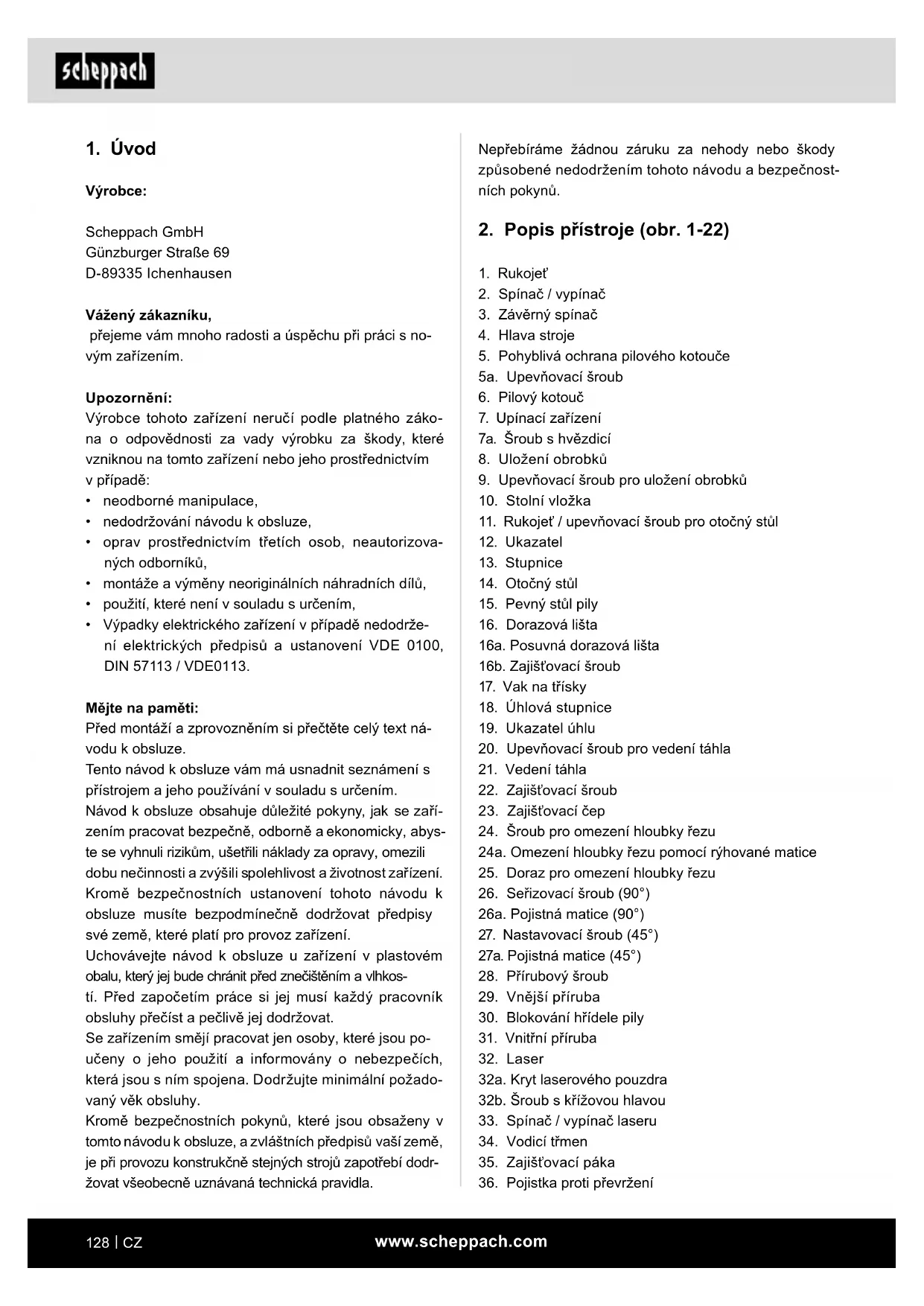 Výrobce: Scheppach GmbH Günzburger Straße 69 D-89335 Ichenhausen Vážený zákazníku, přejeme vám mnoho radosti a úspěchu při práci s no- vým zařízením. Upozornění: Výrobce tohoto zařízení neručí podle platného záko- na o odpovědnosti za vady výrobku za škody, které vzniknou na tomto zařízení nebo jeho prostřednictvím v případě: